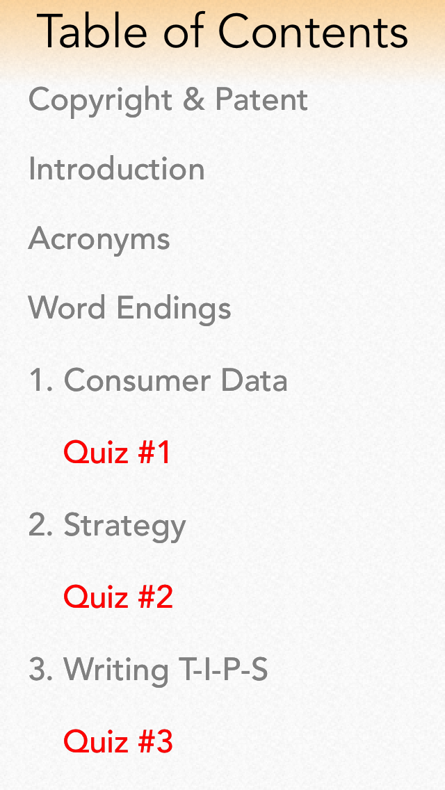 Focus your attention on the key points as you go through the modules, acronym by acronym. Identical word endings unify that module. For instance, Copywriting has "ance" at the end of each key word. You’ll find the interactive quizzes are fun to do. And they’ll make it easy to master each course in a flash!