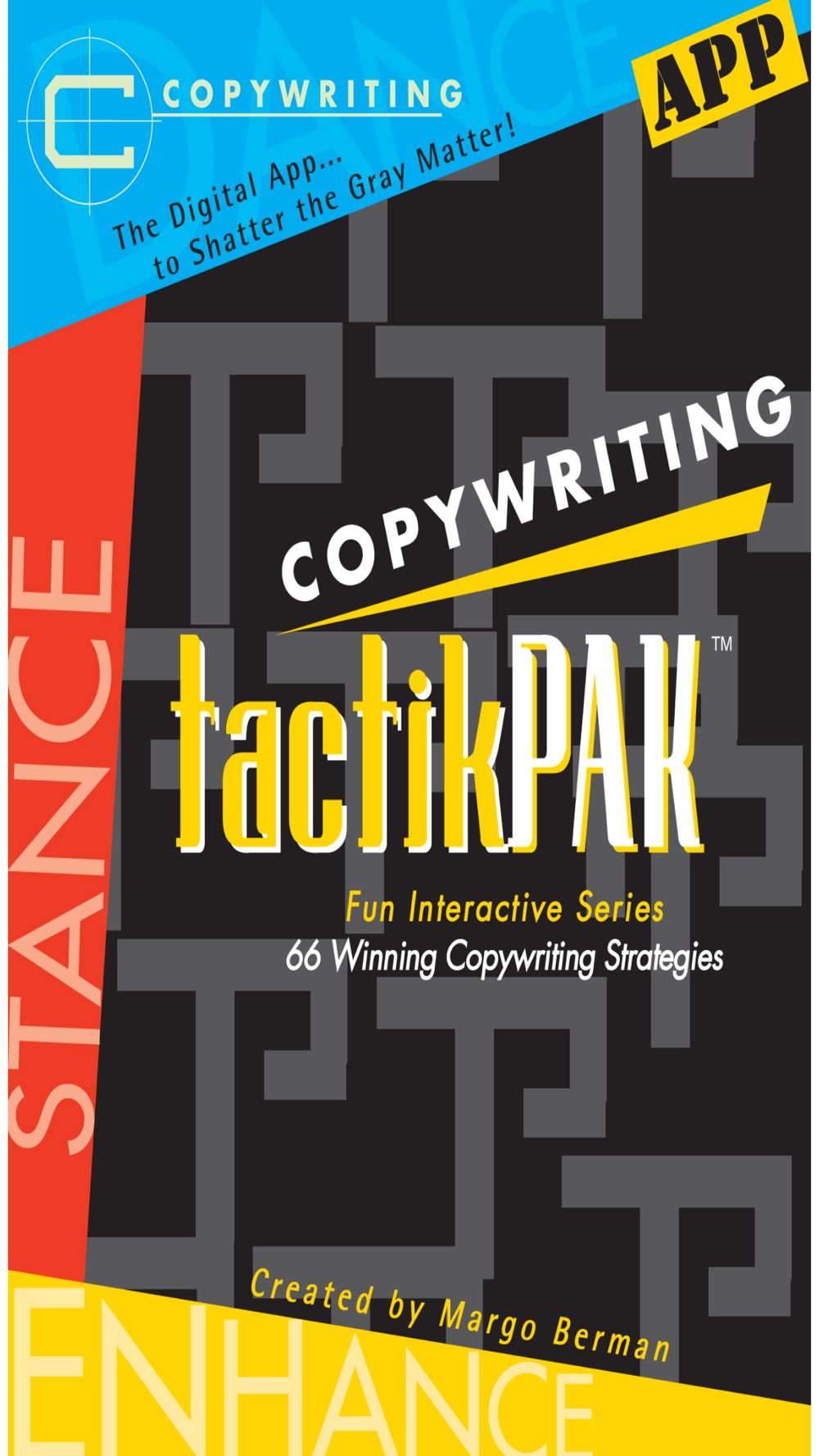 Each one of the tactikPAK™ apps examines a specific principle. Every principle has a matching acronym. For example, in Copywriting, G-R-A-S-P reminds you to understand and then incorporate consumer research. Use the information to guide the creative solution. This will help you develop an on-target and on-strategy message.