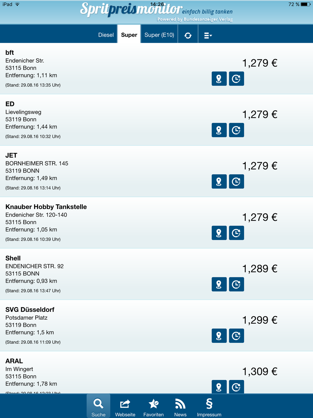 GPS-ORTUNG: Sie können mit der GPS-Ortung sofort die günstigsten Angebote in Ihrer Nähe sehen, oder Sie suchen nach PLZ bzw. Ort.