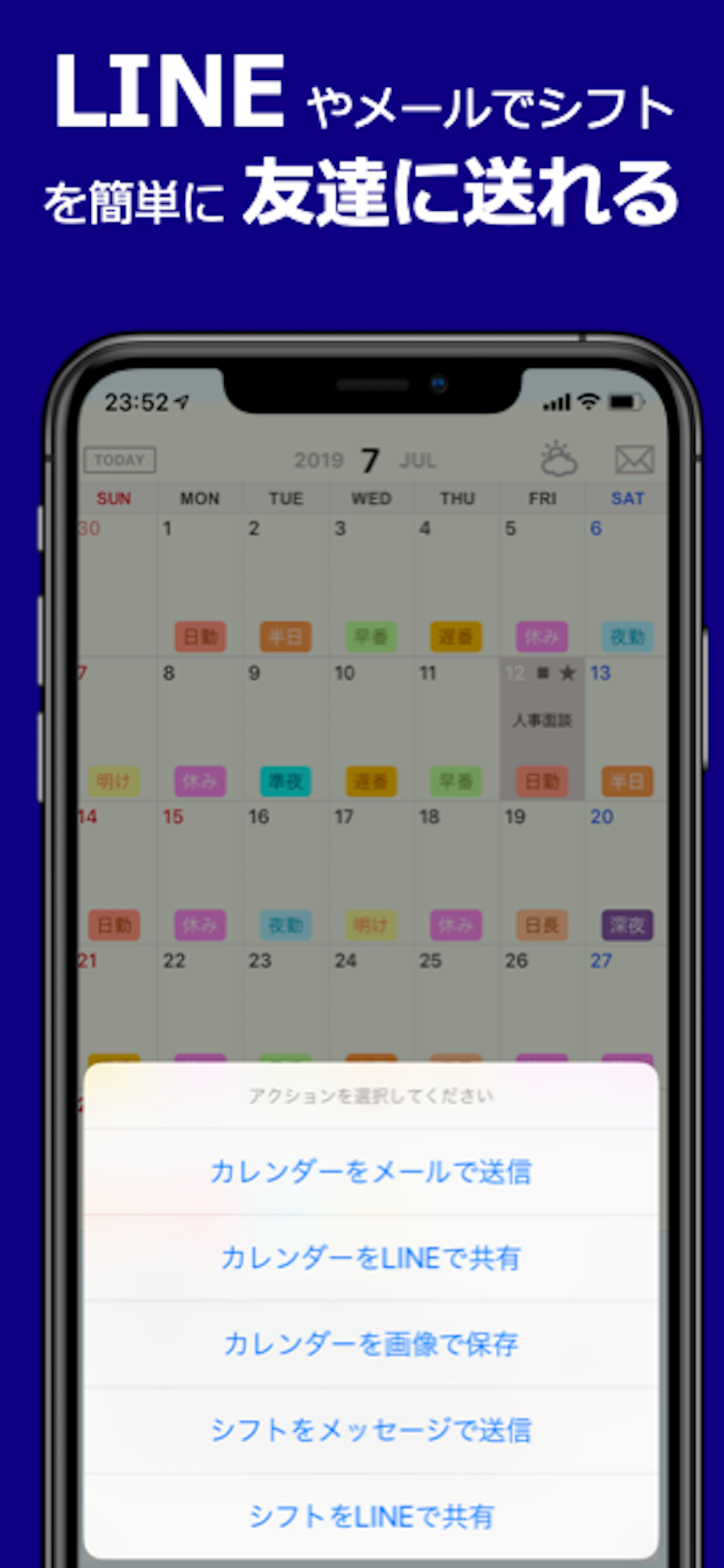 スタンプ感覚で勤務スケジュールをカレンダーに貼り付けられます。カレンダーは祝日にも対応。見易いデザインの為、勤務シフトをカレンダーに直感で貼り付けられます。