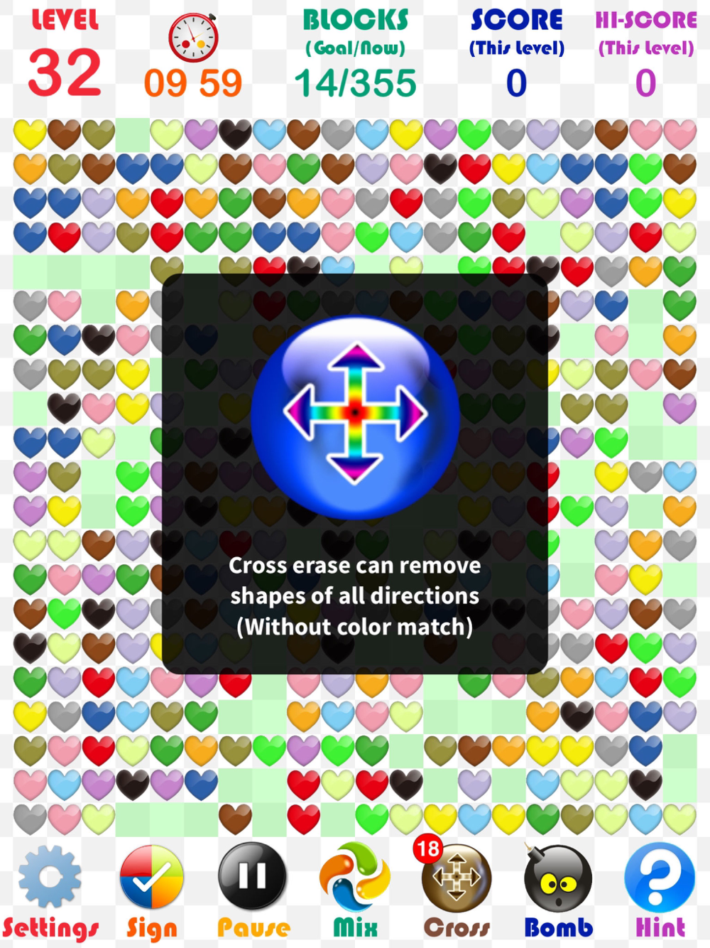 Touch an empty grid to match at least two same-coloured hearts in the cross line. Wrong touches will lead to timing deduction.Don't forget to use the items!