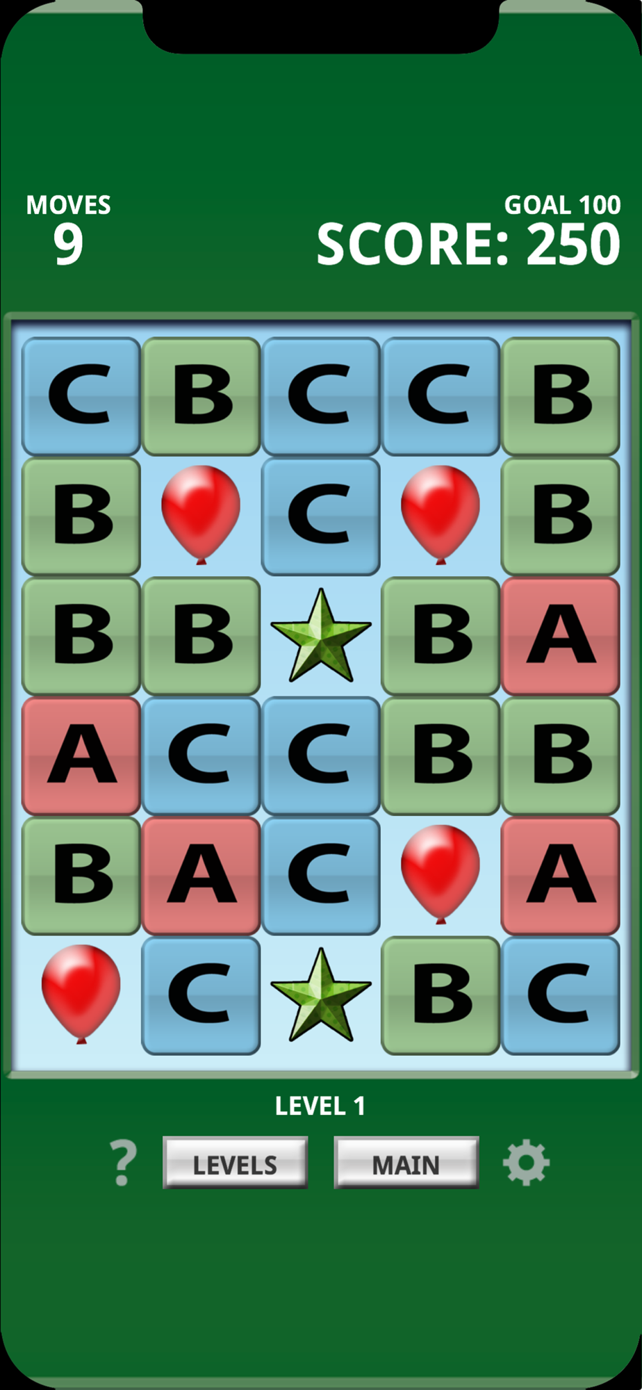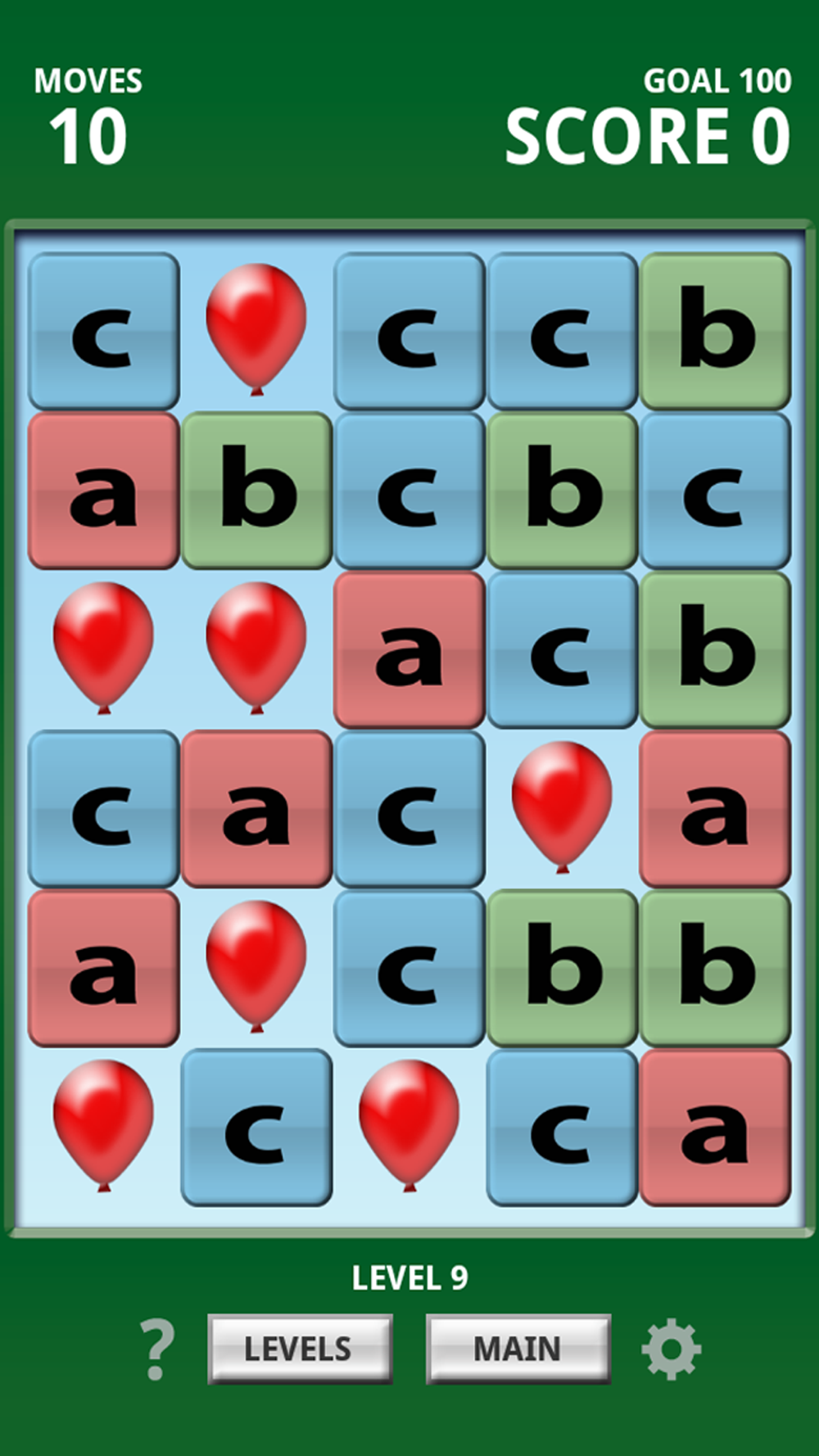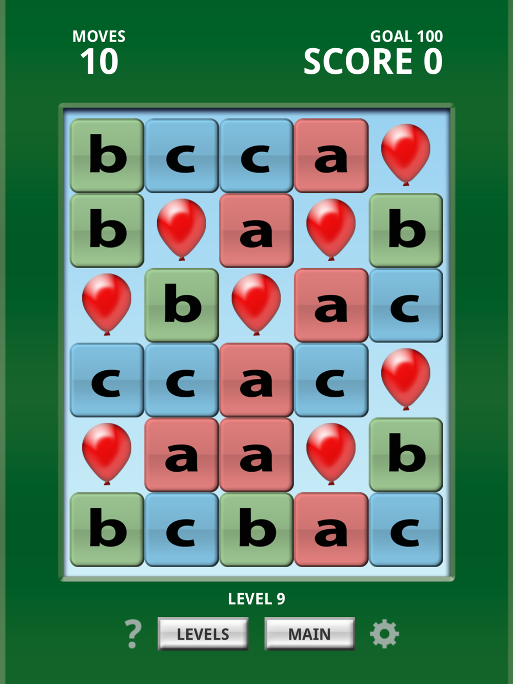 Alphabet Match 3 is a match three puzzle game to help preschool kids learn the letters of the alphabet. When you touch a letter it is spoken which helps kids learn what the letters are. Touch a letter and swipe up, down, left or right to move it. Match three of the same type to get points. If you touch a balloon it will pop so if you want to match three of them you will need to touch and swipe the adjacent item you want to swap it with. If you fail to reach the level goal you can add moves to keep going. Once you complete a level you can replay it for high score. Completing levels will give you coins to buy moves. You can replay levels to try and beat your old scores.