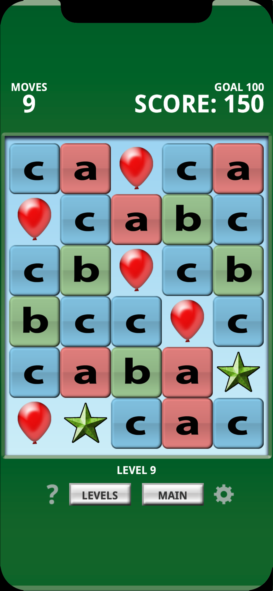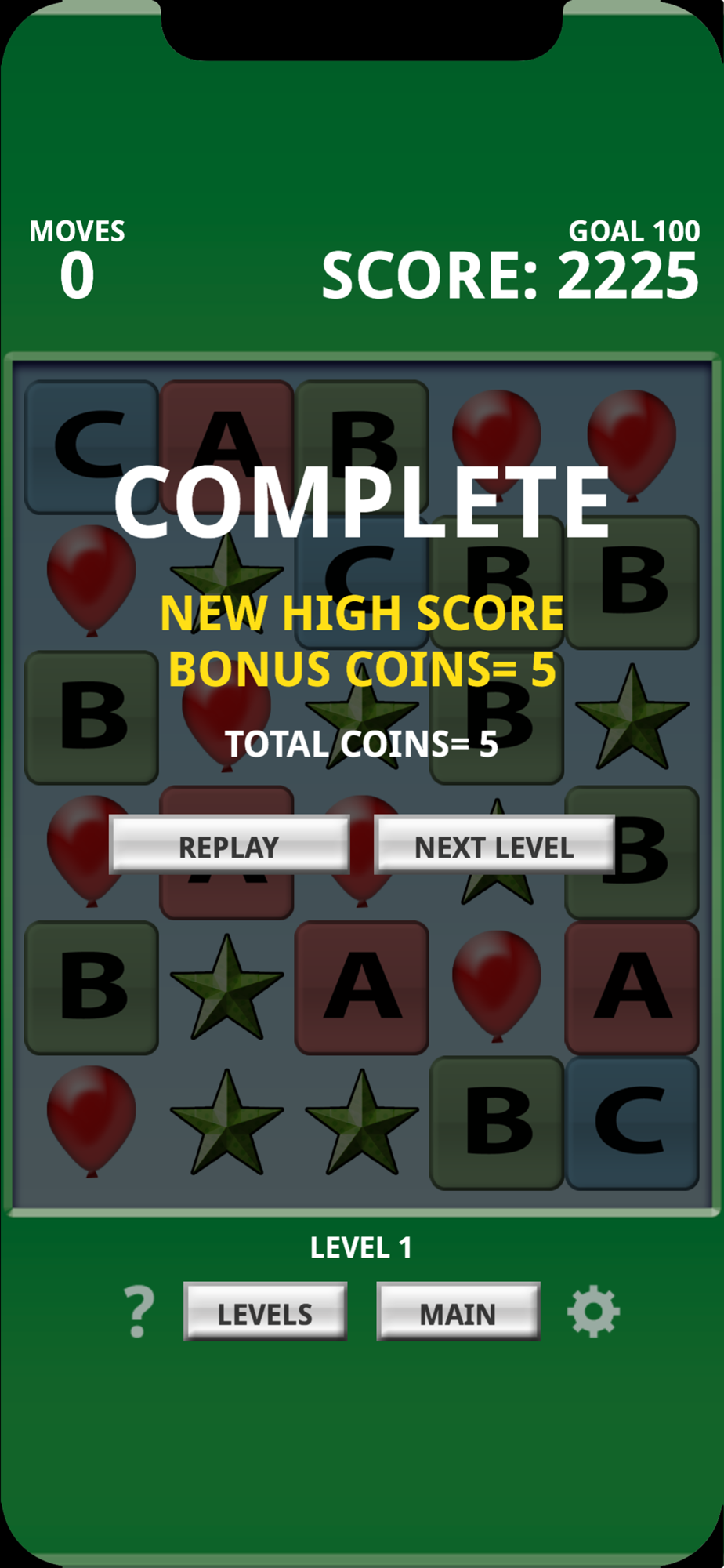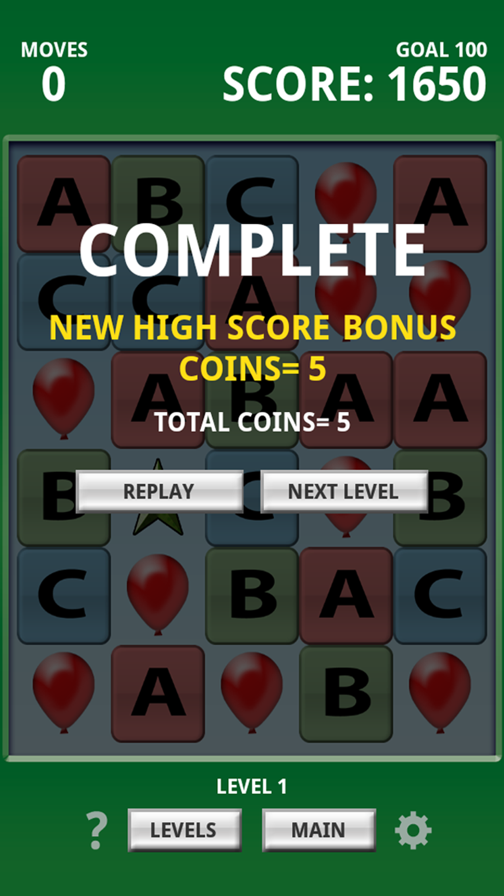 Alphabet Match 3 is a match three puzzle game to help preschool kids learn the letters of the alphabet. When you touch a letter it is spoken which helps kids learn what the letters are. Touch a letter and swipe up, down, left or right to move it. Match three of the same type to get points. If you touch a balloon it will pop so if you want to match three of them you will need to touch and swipe the adjacent item you want to swap it with. If you fail to reach the level goal you can add moves to keep going. Once you complete a level you can replay it for high score. Completing levels will give you coins to buy moves. You can replay levels to try and beat your old scores.