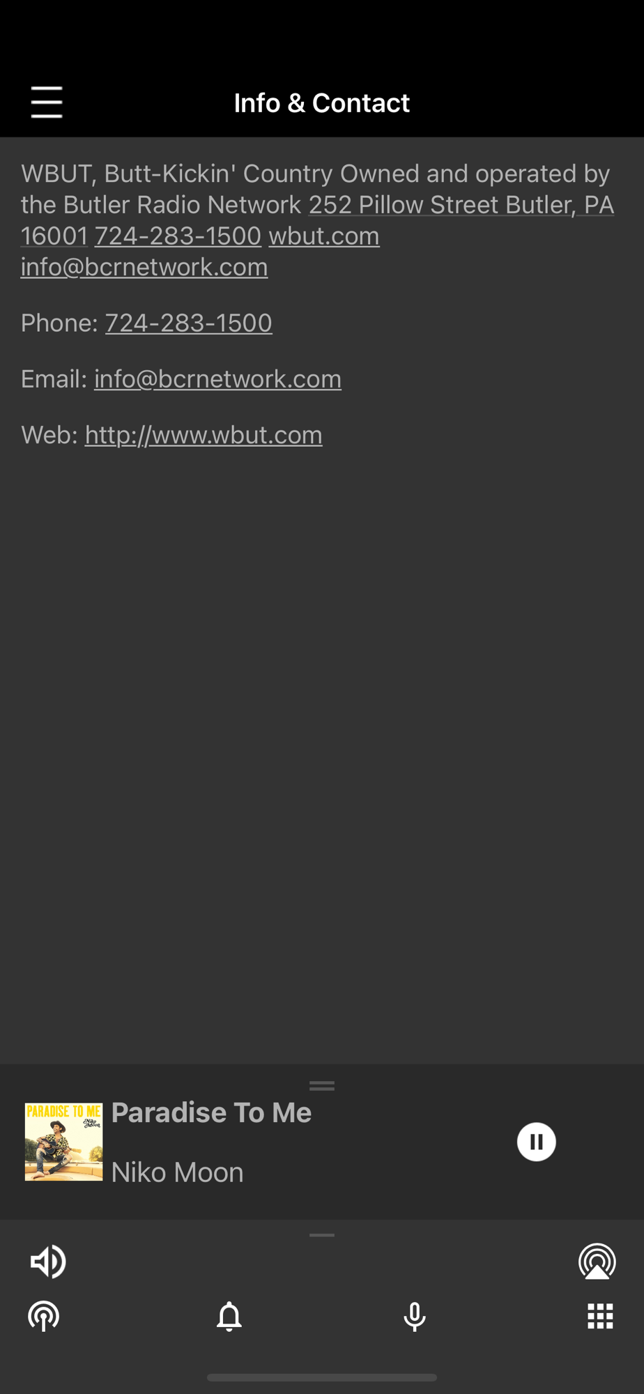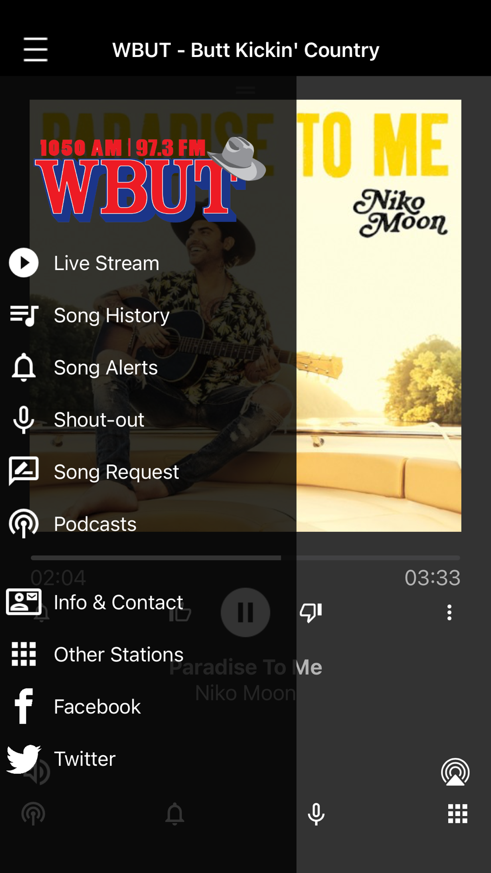 WBUT 1050-am and 97.3-fm is Butler PA's Butt-Kickin' Country Station. Broadcasting live from the City of Butler and offering today's hottest Country music and your all-time favorites. Tune in weekday mornings for the Breakfast Club and a look at the latest in local news, sports and weather. Play along with our digital contests and stay up-to-date with the current Country music news. Catch all the action of Butler's local high school football and basketball teams. Plus the best in Country music programming.