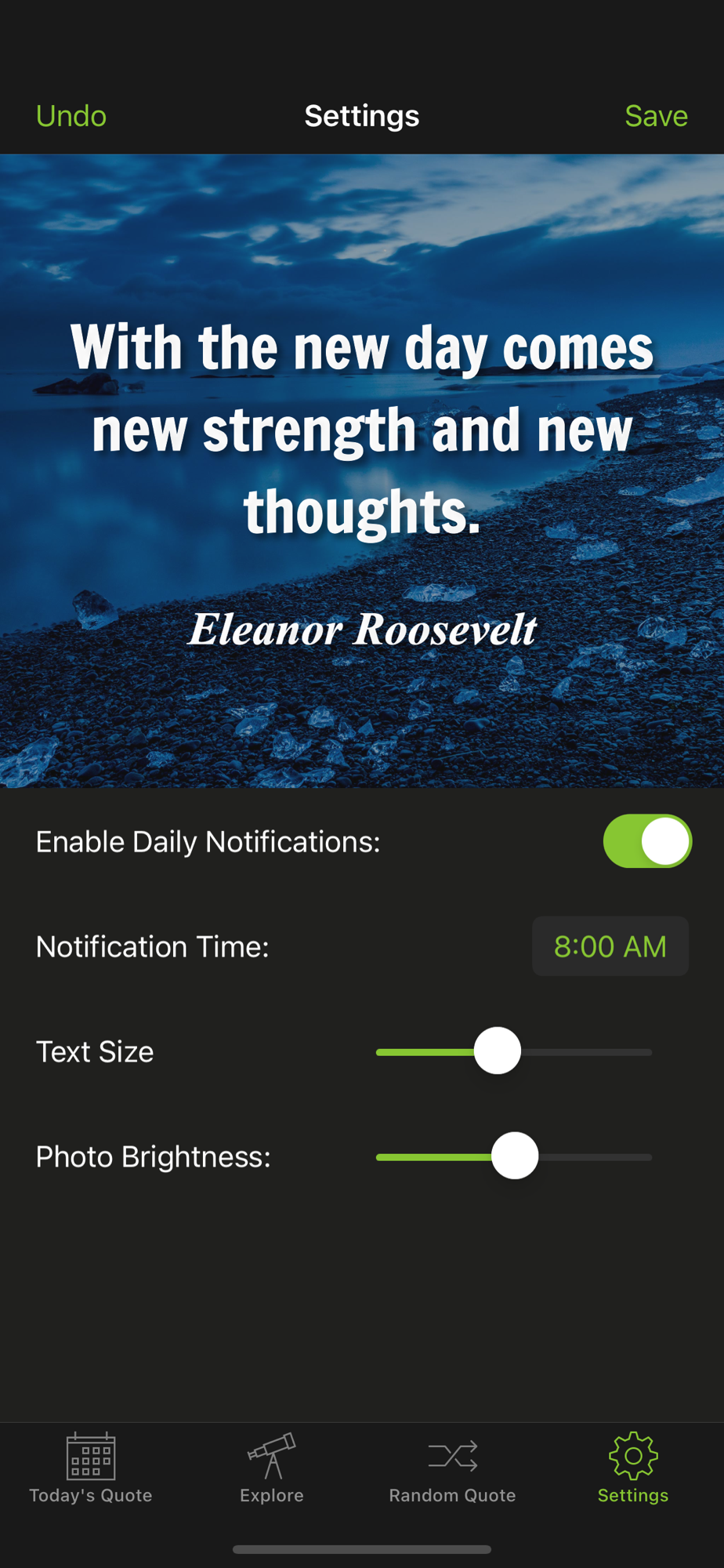 Get Today's Quote - our inspiring quote of the day - on your iPhone or iPad Notifications screen or your Home Screen. Use Settings to choose the time you prefer to receive the quote of the day and enjoy sharing our amazing picture quotes.