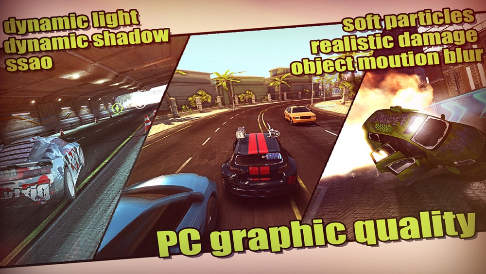 We support the most powerful tablets and phones with OpenGL ES 3.0! Therefore, we highly detailed level of computer graphics, a large number of dynamic and destructible objects. Modern effects such as dynamic lighting and shadows, ssao, soft particles, object motion blur, Realistic damage, deferred shading.