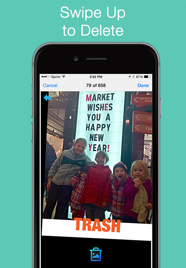Swipe left and right to compare photos and swipe up to delete. CleanUp enables you to quickly and easily clean your photo library from 1,000 photos to 100. Swipe left and right to compare photos and swipe up to delete the ones you don't need. We all have thousands of photos on our phone and 90% of the photos are just okay and should be deleted. If you have 1,000 photos delete 900 of the mediocre photos and keep 100 great photos.