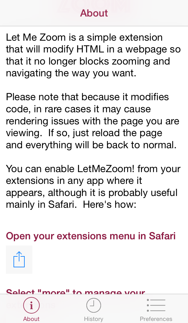 A simple extension that re-enables zooming in webpages that block it and returns control of the viewing experience back to you. Simply enable this extension in your Safari activities menu, and select it when you need it.