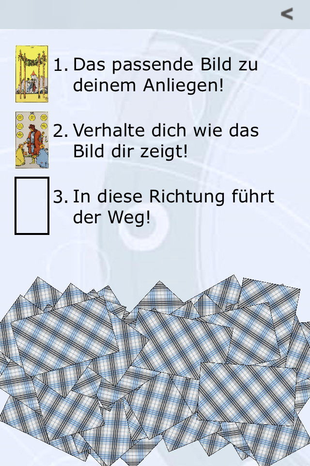 Es werden die klassischen Tarotkarten von Arthur Edward Waite, illustriert durch Pamela Colman Smith, verwendet. Sie dienen in anregender bildhafter Weise der Visualisierung persönlicher Gedanken und Anliegen, ermöglichen dadurch Reflexion, geben Feedback und fordern auch sinnvoll heraus. Und sie sollen die Spielfreude aktivieren.