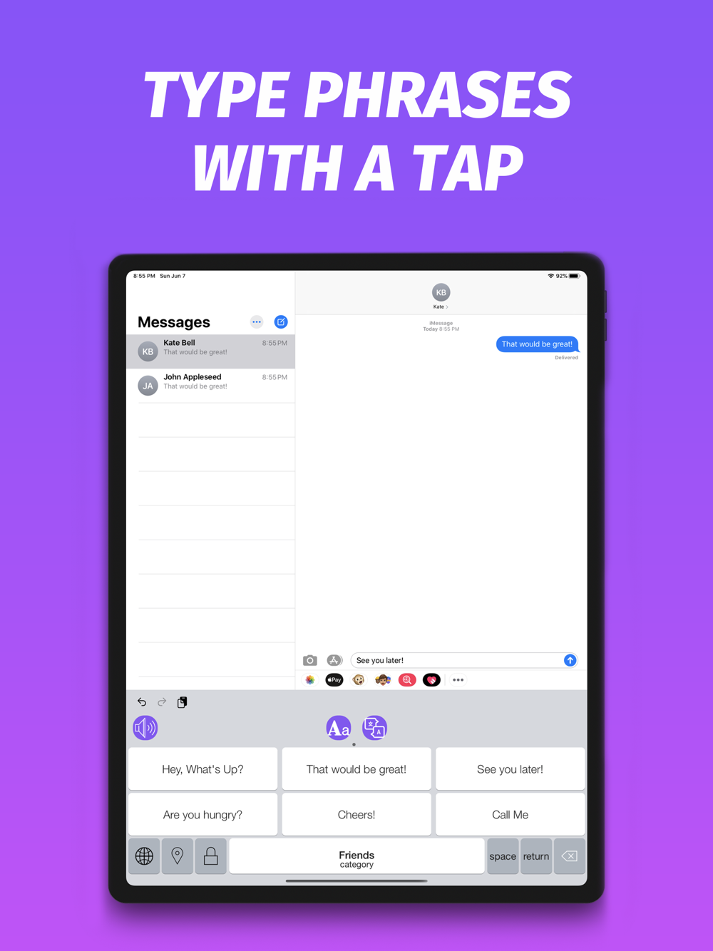 Tired of typing the same response over and over all the time? Phraseboard customizes and categorizes your keyboard with easy to access phrases.