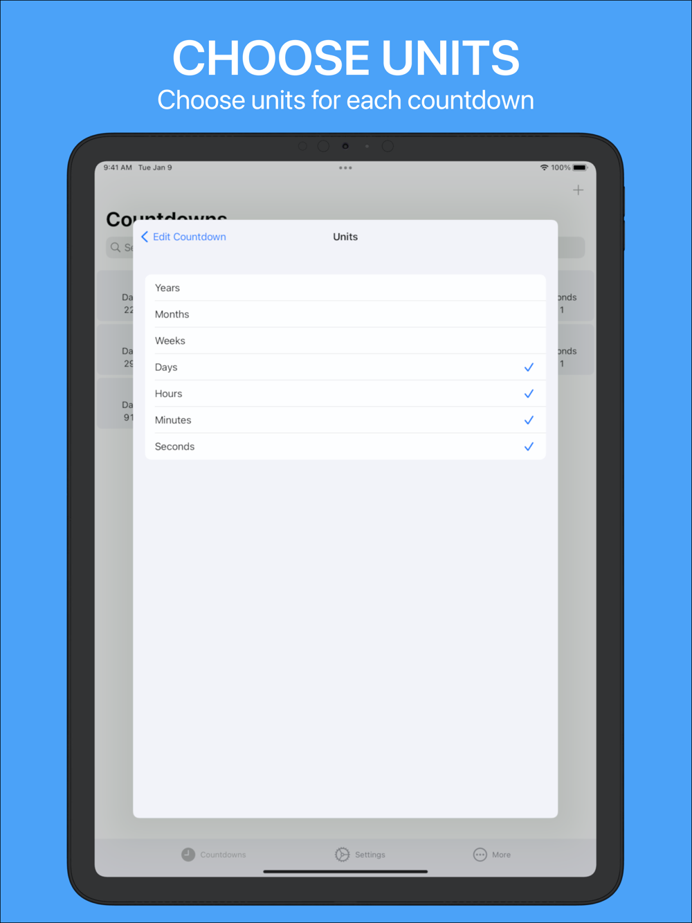 - Multiple unit options (days, weeks, etc.) and icons to make your countdown your very own.