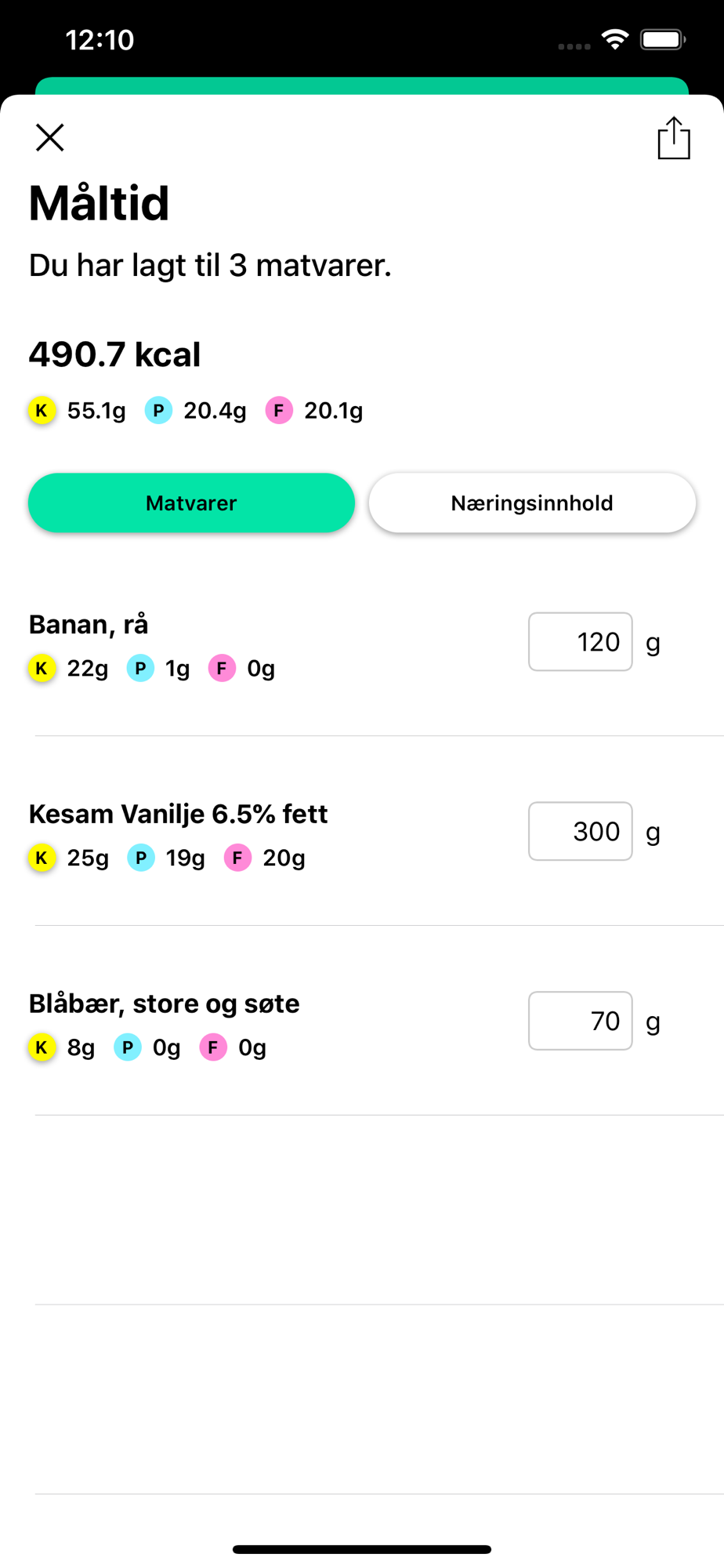 - Sett sammen måltider og les av hvor mye kalorer, fett, protein og karbohydrater måltidet inneholder.