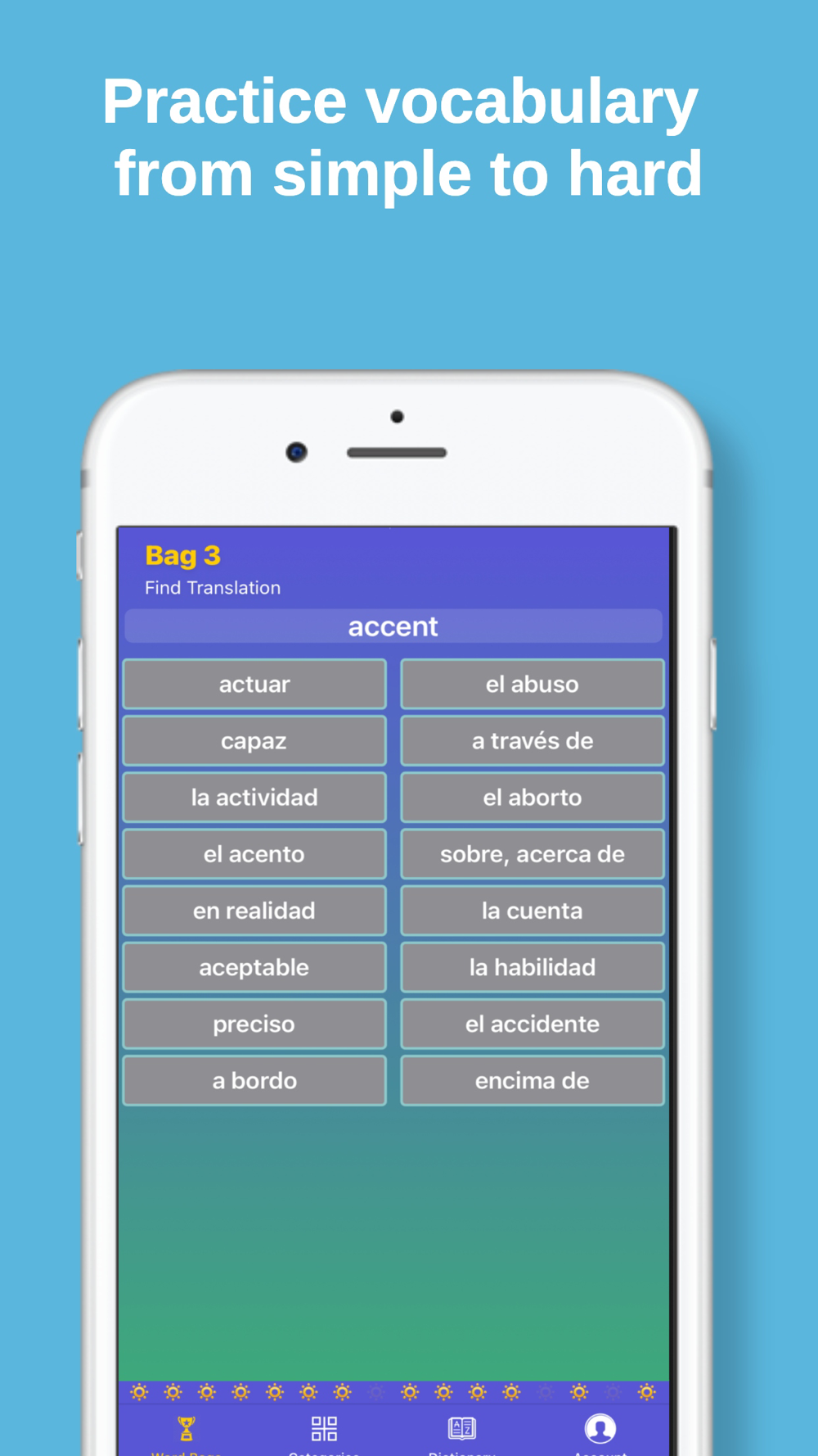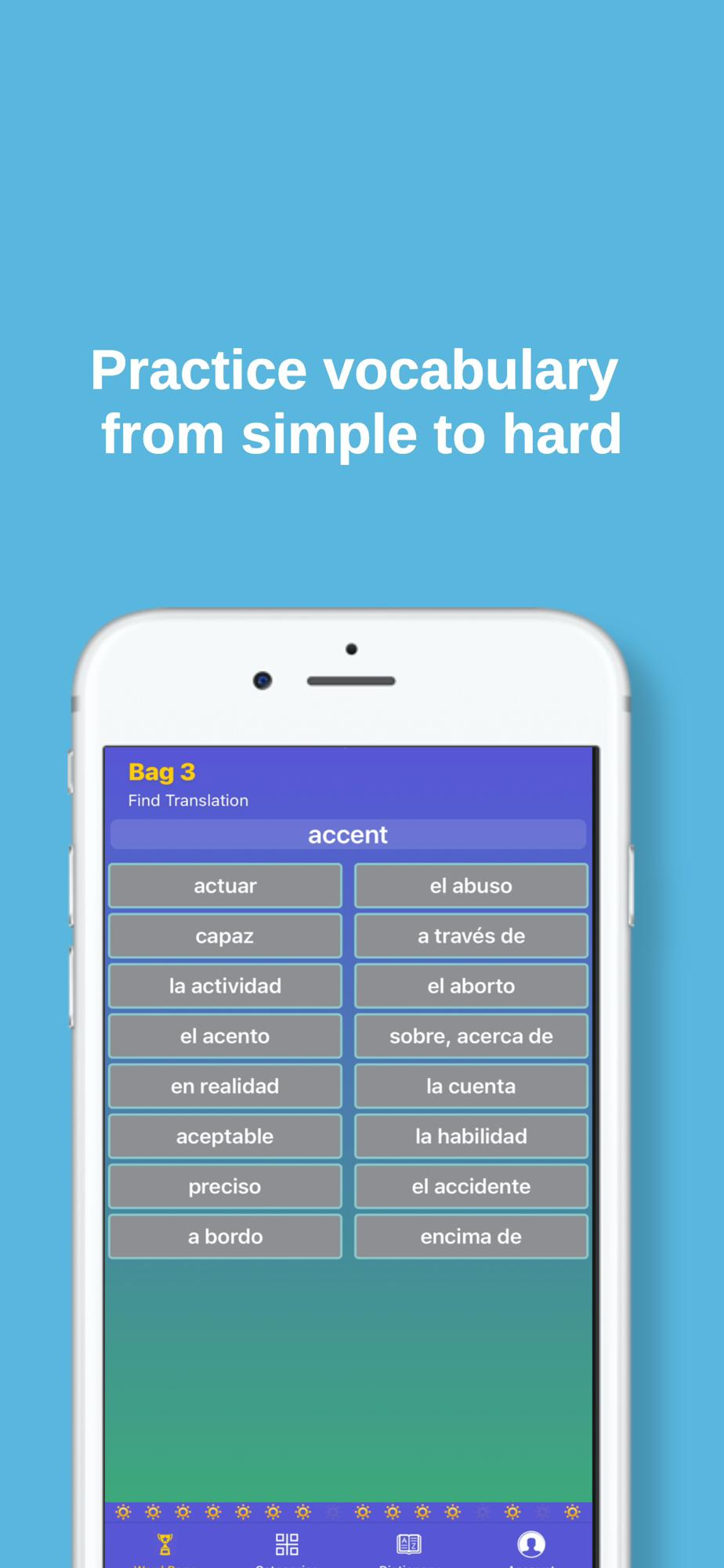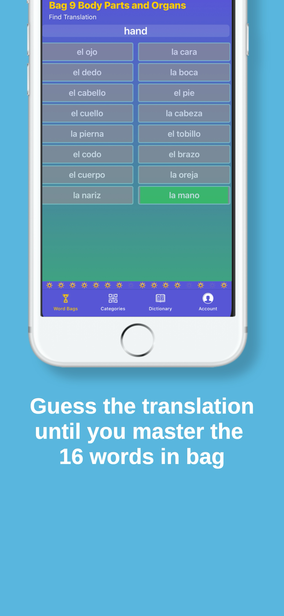 “Spanish 16” covers all these techniques with an extremely organized system we call “Word Bags” - a feature that displays a set of themed words for students to translate. Each word bag is ordered from easy to difficult and contains 16 words that are shown randomly for the student to translate correctly. The app keeps score as the student progresses and awards a trophy once all words are translated correctly.