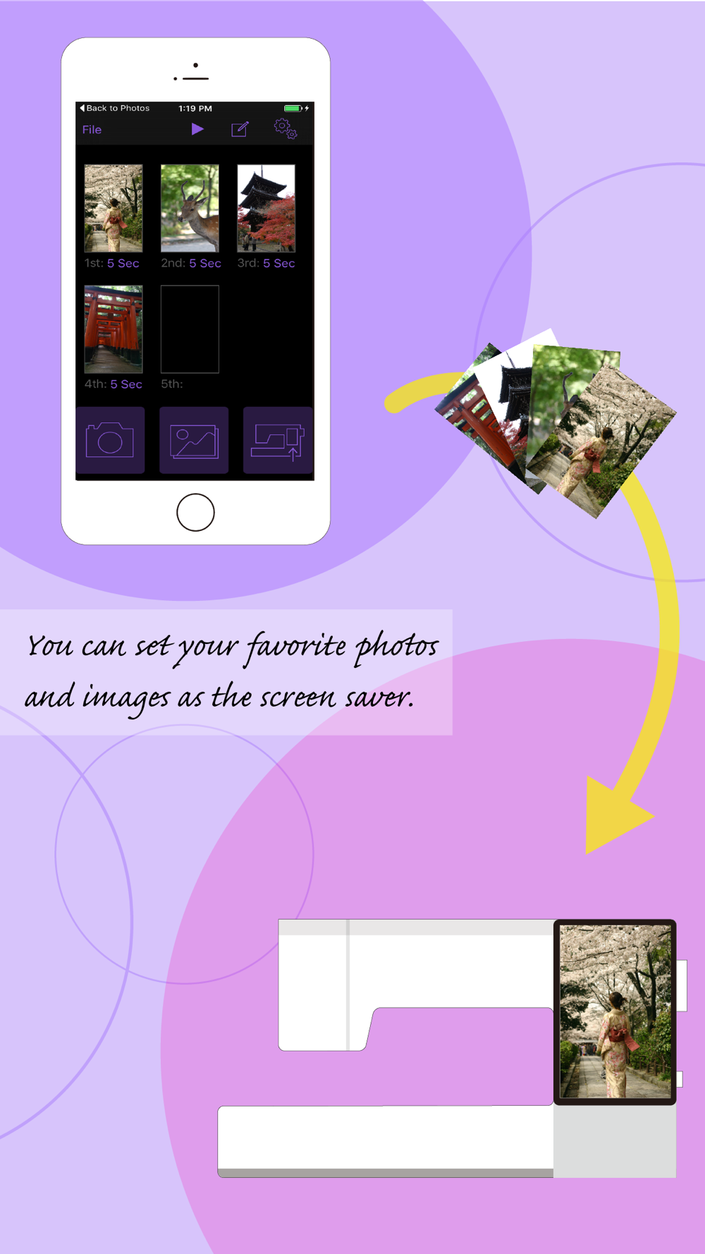 The Screen Saver Tool allows you to set the screen saver image for your Janome sewing machine using your iOS device and Wireless LAN. Photos taken and images saved on your device can be used as screen savers for your sewing machine and you can enjoy your own original screen saver!