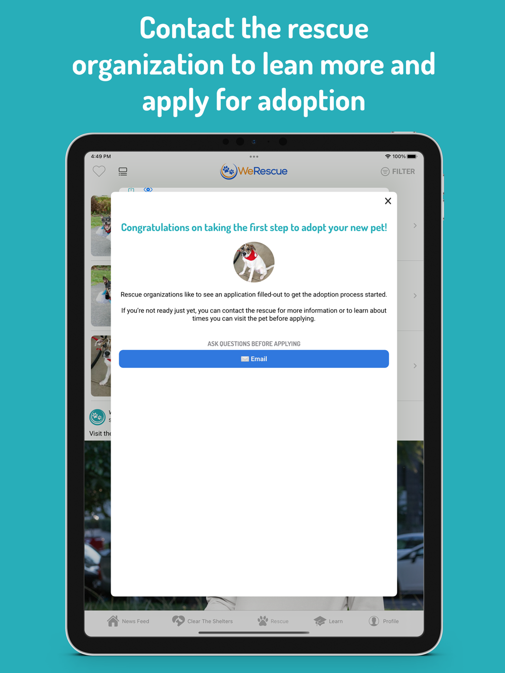 Share the love: WeRescue lets you share pets on social media, SMS text, Pinterest, Facebook, Twitter, WhatsApp, and more. Even if you're not ready to adopt, you can help spread the word and save lives by sharing beautiful images with friends. They'll see the exact pet you shared when they open the WeRescue app, making it easy for them to learn more and potentially adopt.