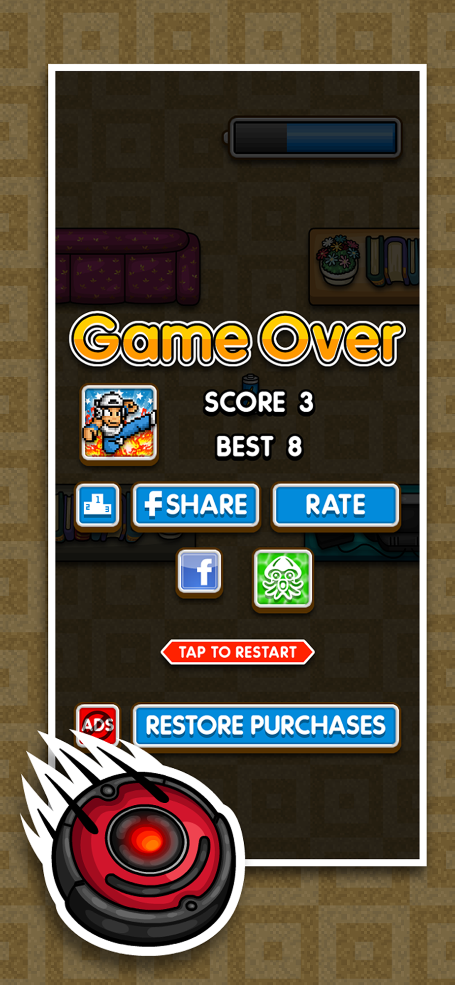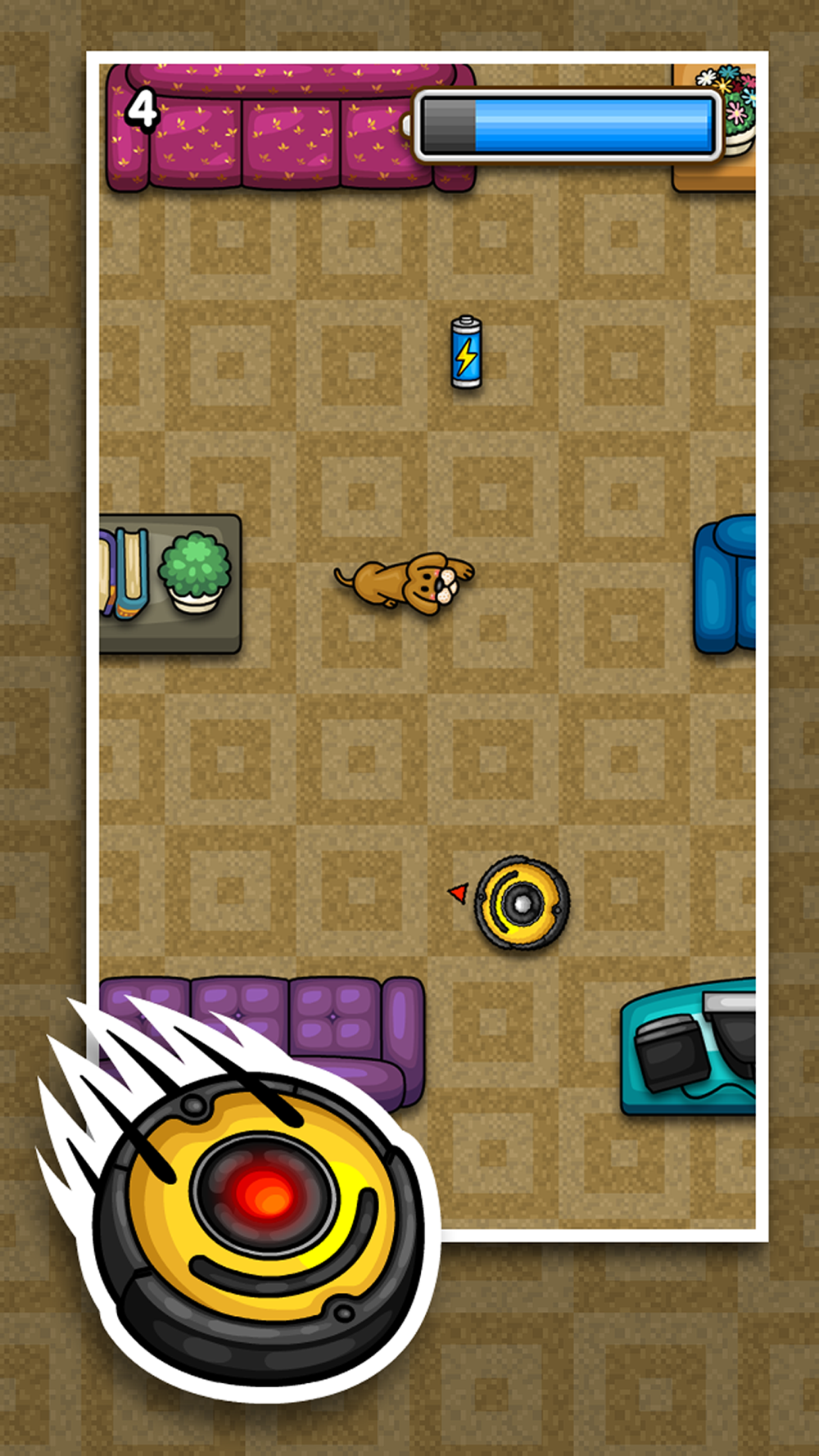 The robot vacuum cleaner is running low on battery. Help it recharge and race as far as possible by reaching the battery power-ups. Avoid bumping into furniture and pet dogs. Enjoy!