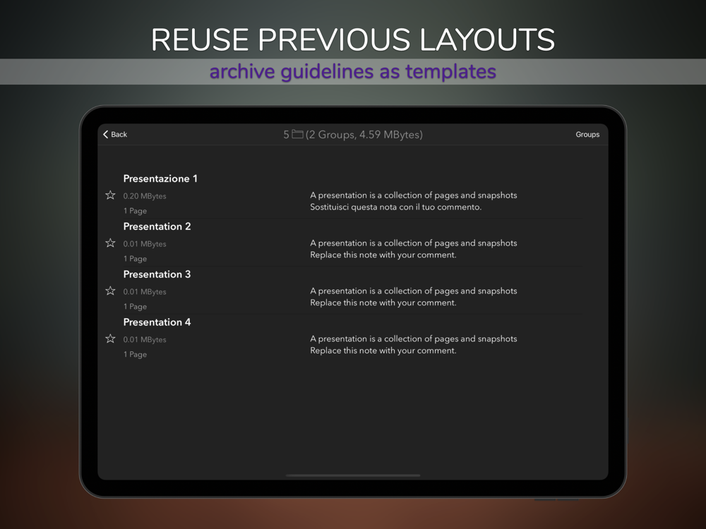 We designed this app to reduce drastically the space used on your device (less than 50 Mbytes), so you can work seamlessly on your device anywhere!