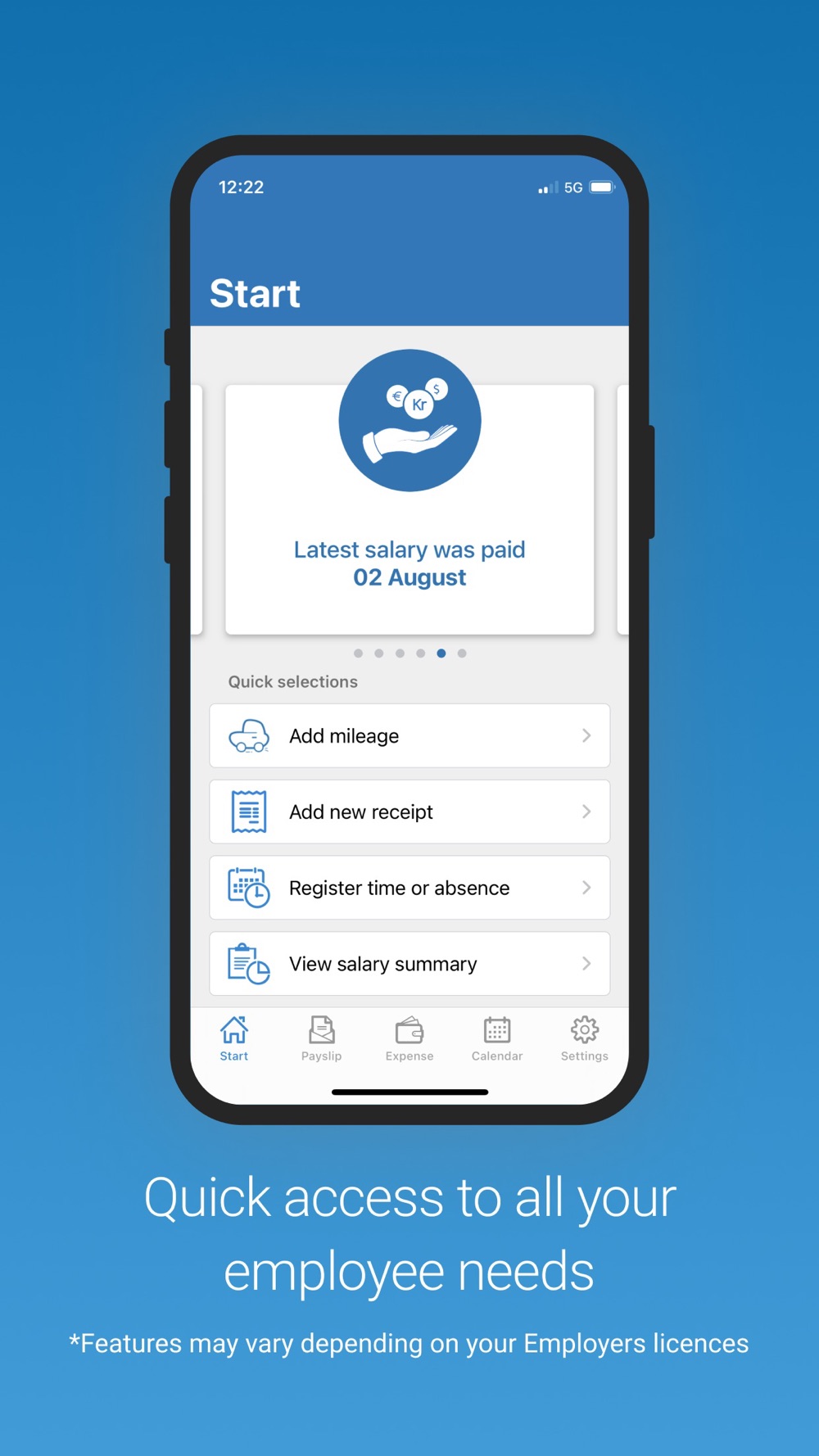 Stay updated with the latest information: Access your payslips and receive automatic notifications for incoming new ones. Register receipts and mileage expenses and send them for approval. Easily enter your work hours, register your sick leave or apply for vacation on the go.