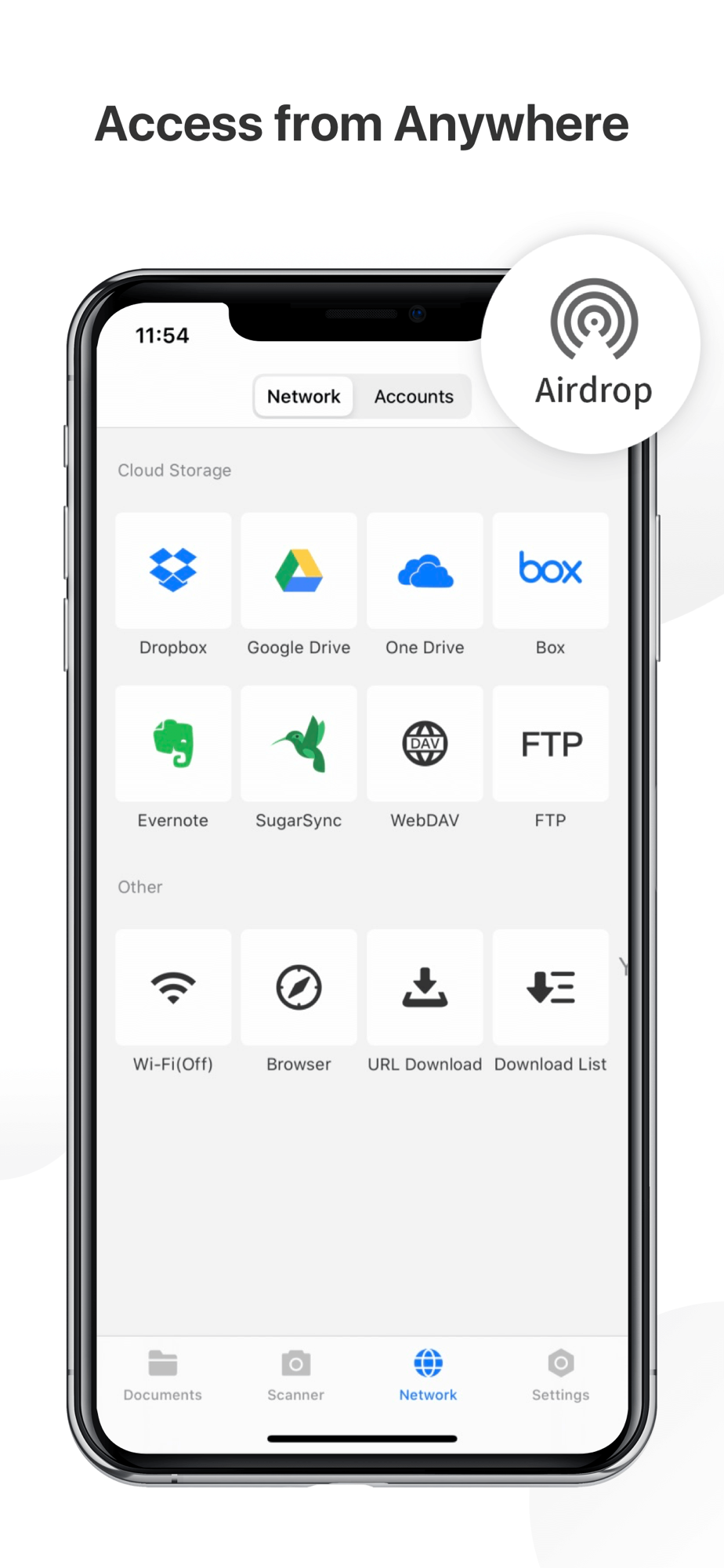・ Store and secure files on iCloud Drive, Dropbox, OneDrive, Google Drive, Evernote, Box, FTP, WebDav, etc.