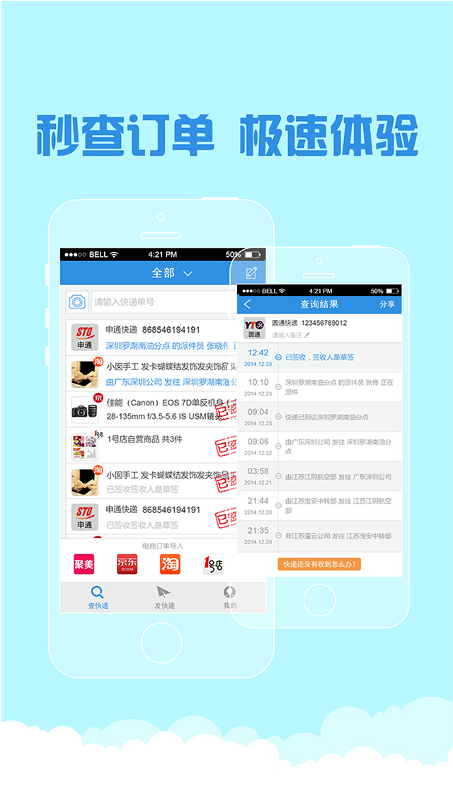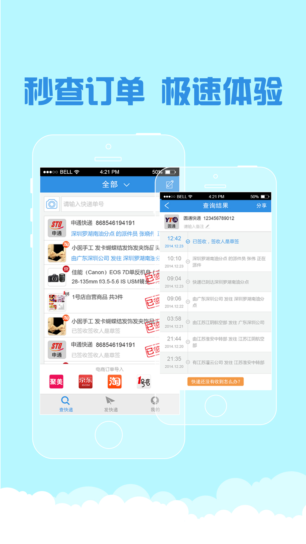 您也可以自己输入或者扫描单号进行快递查询,支持申通,中通,圆通,韵达,顺丰,EMS,中国邮政,天天,汇通,全峰,国通,优速,速尔,快捷等国内各大快递公司的快递单号查询。