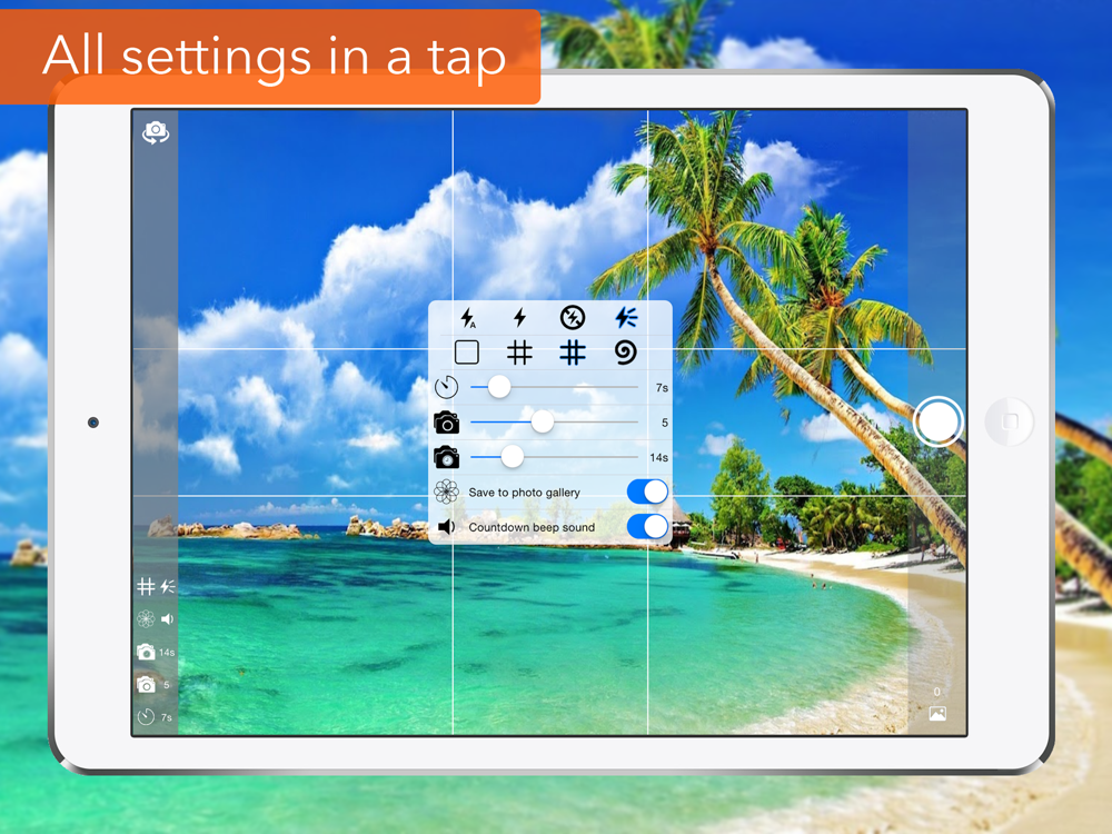 A simple and complete app for self-timer, continuous shooting and selfie, with grills, timer and adjustable intervals!