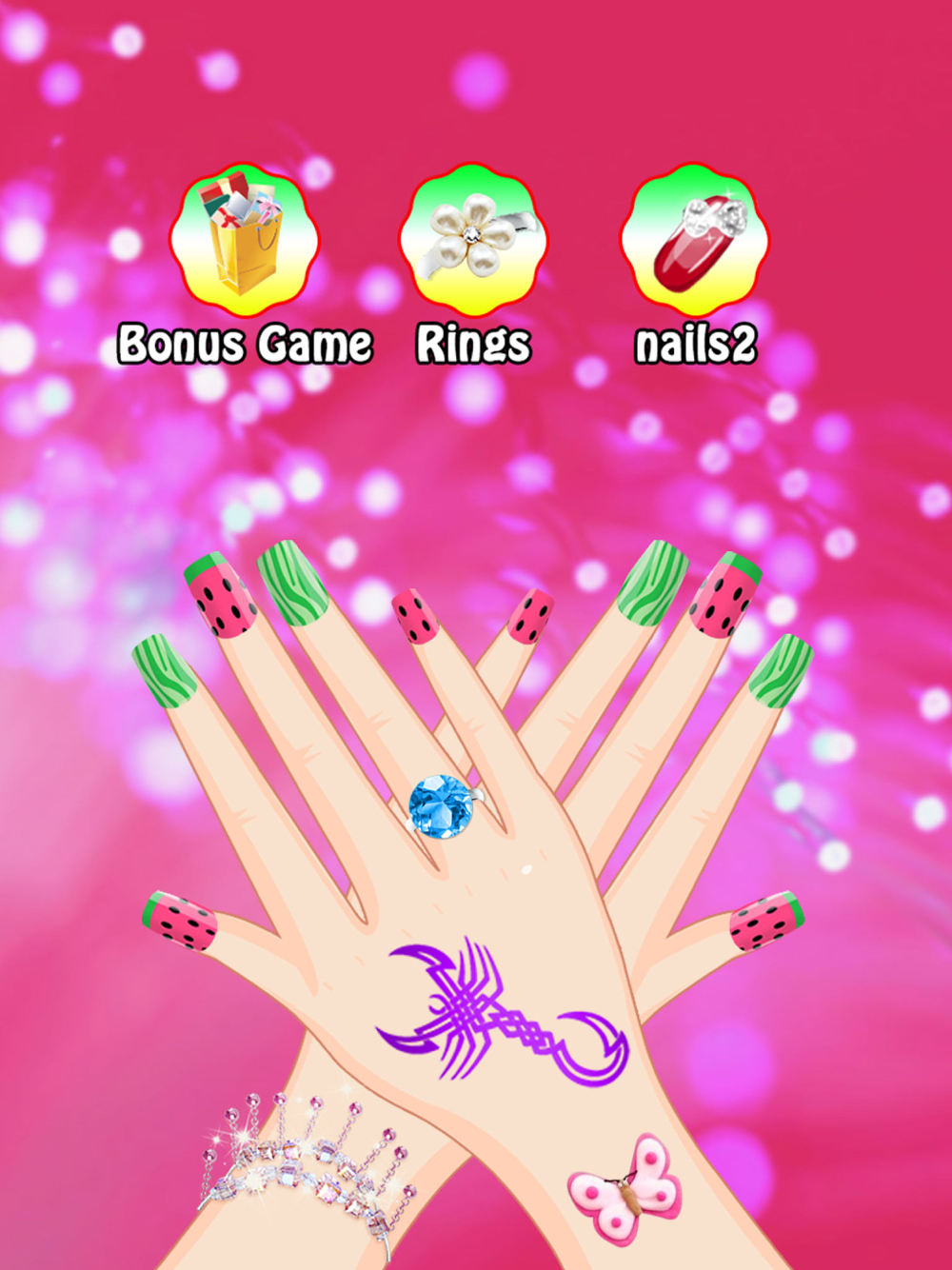 Little Girls our new game nails spa salon is fun for you. In this game you can make the beautiful princess hand more beautiful by making her nails polished or with stylish cartoonish nails. There are many rings, bracelets, polymers and tattoos for nail spa salon.
