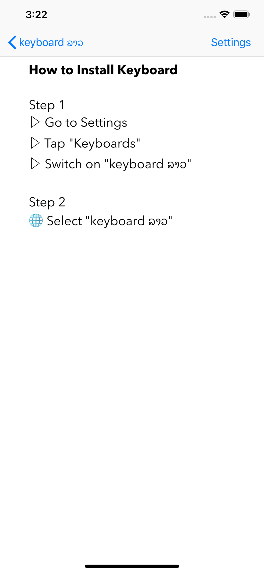 You can now type Lao to your friends and family. With the new Keyboard Lao iOS keyboard extension. Turn on the keyboard in the App Setting and type Lao in any app that allows keyboard extension.