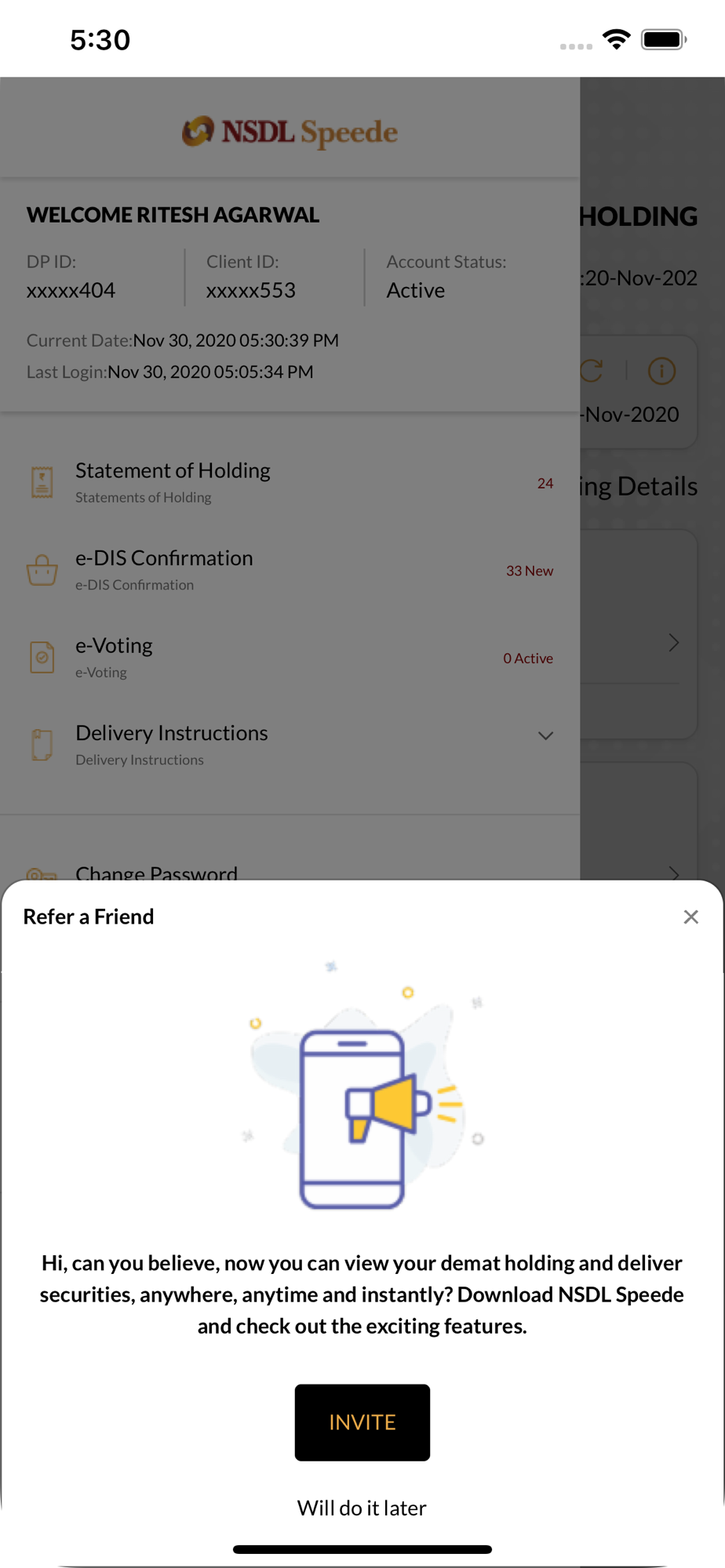 For online registration, follow simple steps after downloading App. If you are already a User of IDeAS or SPEEDe system of NSDL, the same credentials (i.e. User ID and Password) will work.