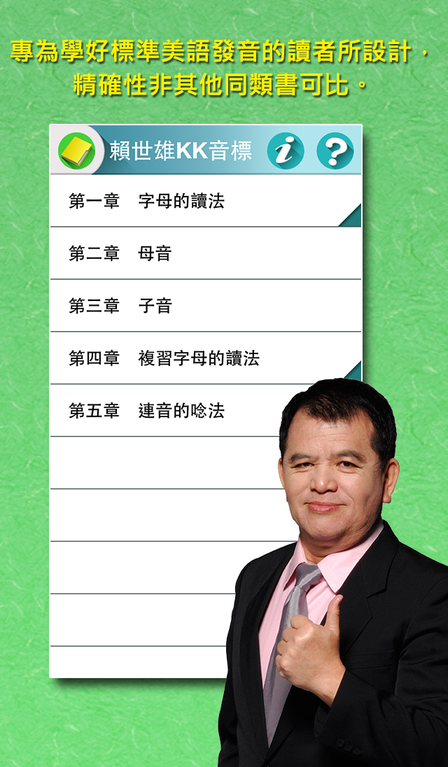 《賴世雄KK音標》App課程內容是天王名師賴世雄個人幾十年來學習發音的心得,盡量用淺顯的用語,希望讀者全憑自修就可看得懂。如想進一步學習,可以加購教學影片,由賴世雄教授親自解說,並搭配美語教學專業老師示範嘴型,學習音標輕鬆易懂,除有發音練習,亦配合單字句子作示範,跟著練習可說出標準英語。