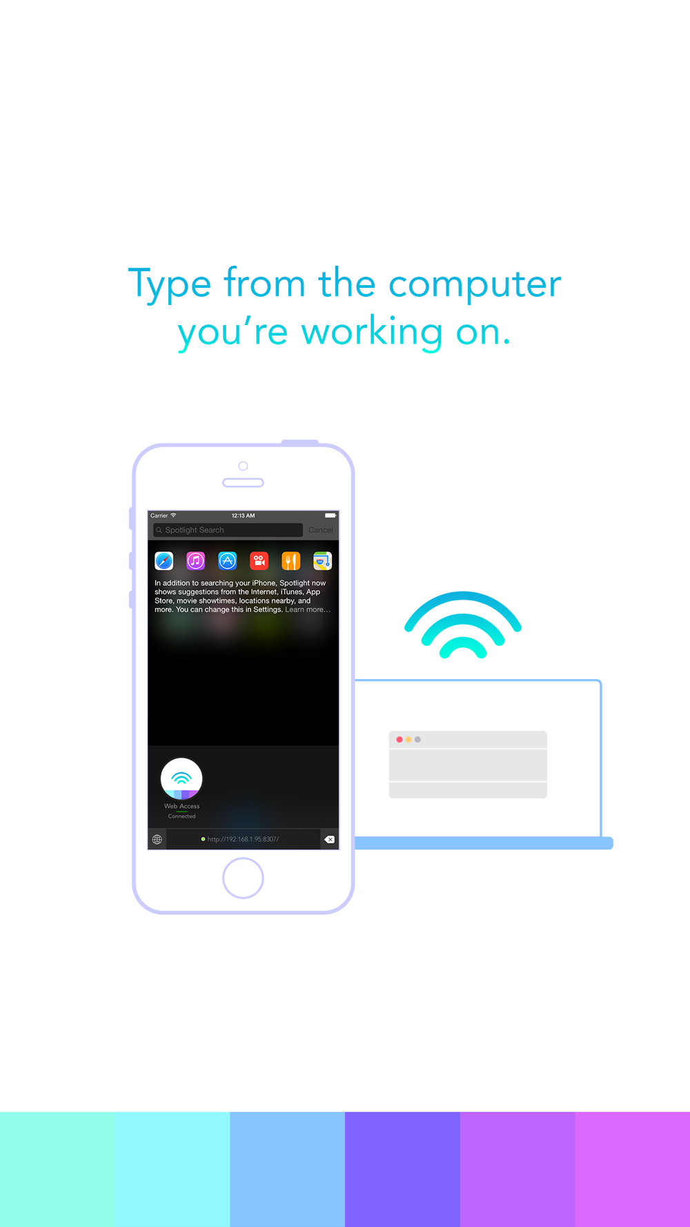 With AirType, you just have to type with your computer. Open the AirType Keyboard on your iPhone, browse to your keyboard's *web access portal, then you can type directly on computer to your iPhone.