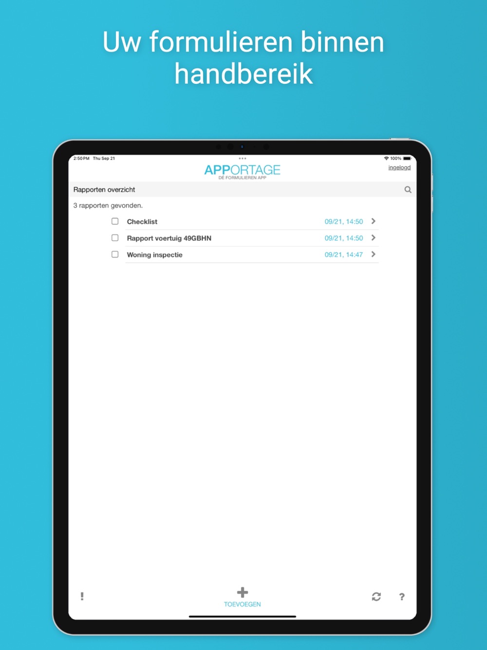 Met Apportage kunt u eenvoudig en snel rapporten maken met smartphones en tablets. Door de handige invoervelden, de mogelijkheid foto's toe te voegen en de mogelijkheid direct op locatie gewoon via de smartphone of tablet een handtekening te (laten) zetten. Er kan vervolgens direct een volledig opgemaakte PDF verstuurd worden. Klaar!