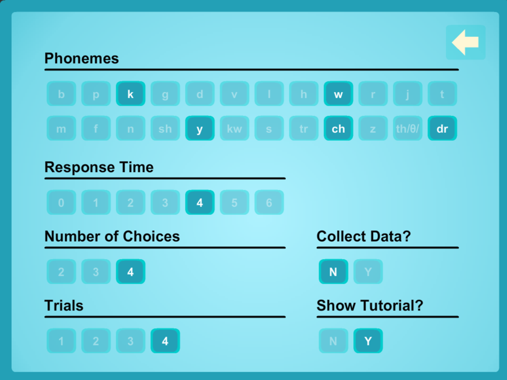 With Touch Sound, children can practice and improve identification of initial phonemes. Adults select the phonemes, the length of time between the task direction and the prompt, number of trials, and number of multiple-choice offerings.