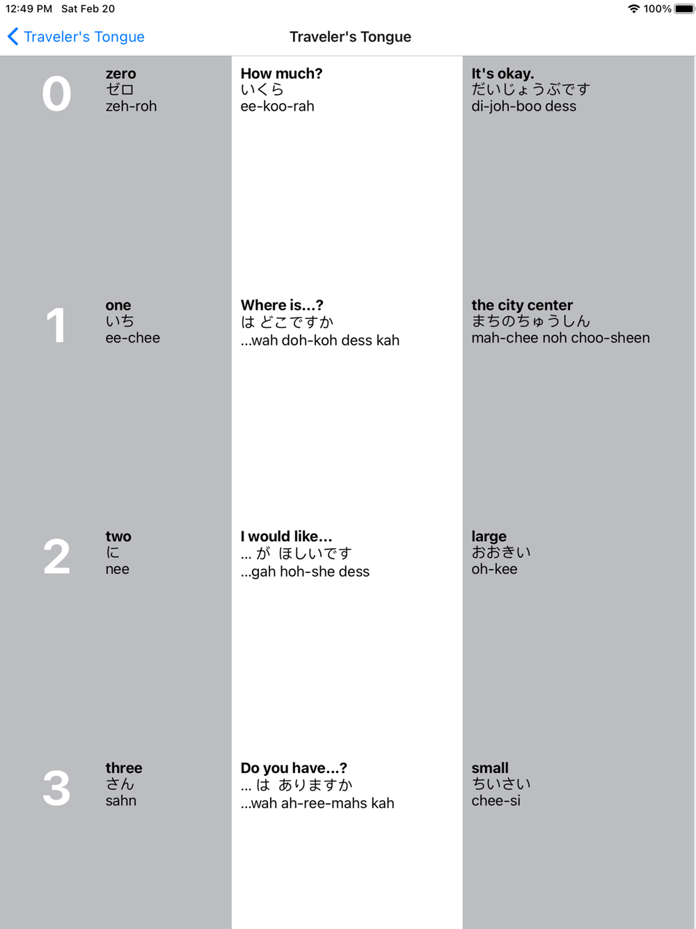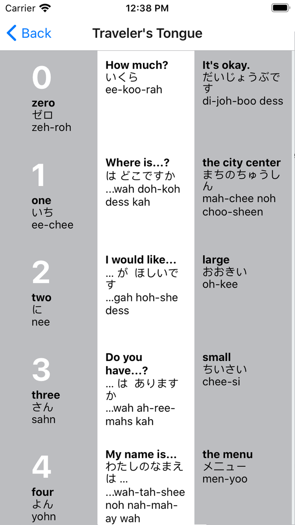When we travel to a foreign country we are demonstrating an interest in that culture. Speaking a little of the native language is part of the cultural experience. There are many Applications and phrase books on the market that offer far more words and phrases, and they are excellent reference sources. However, Traveler’s Tongue provides the most essential and practical words and phrases. They are meant to be learned because you will have an opportunity to use them often. Each entry provides a written phonetic spelling of the word as well as an auditory function.