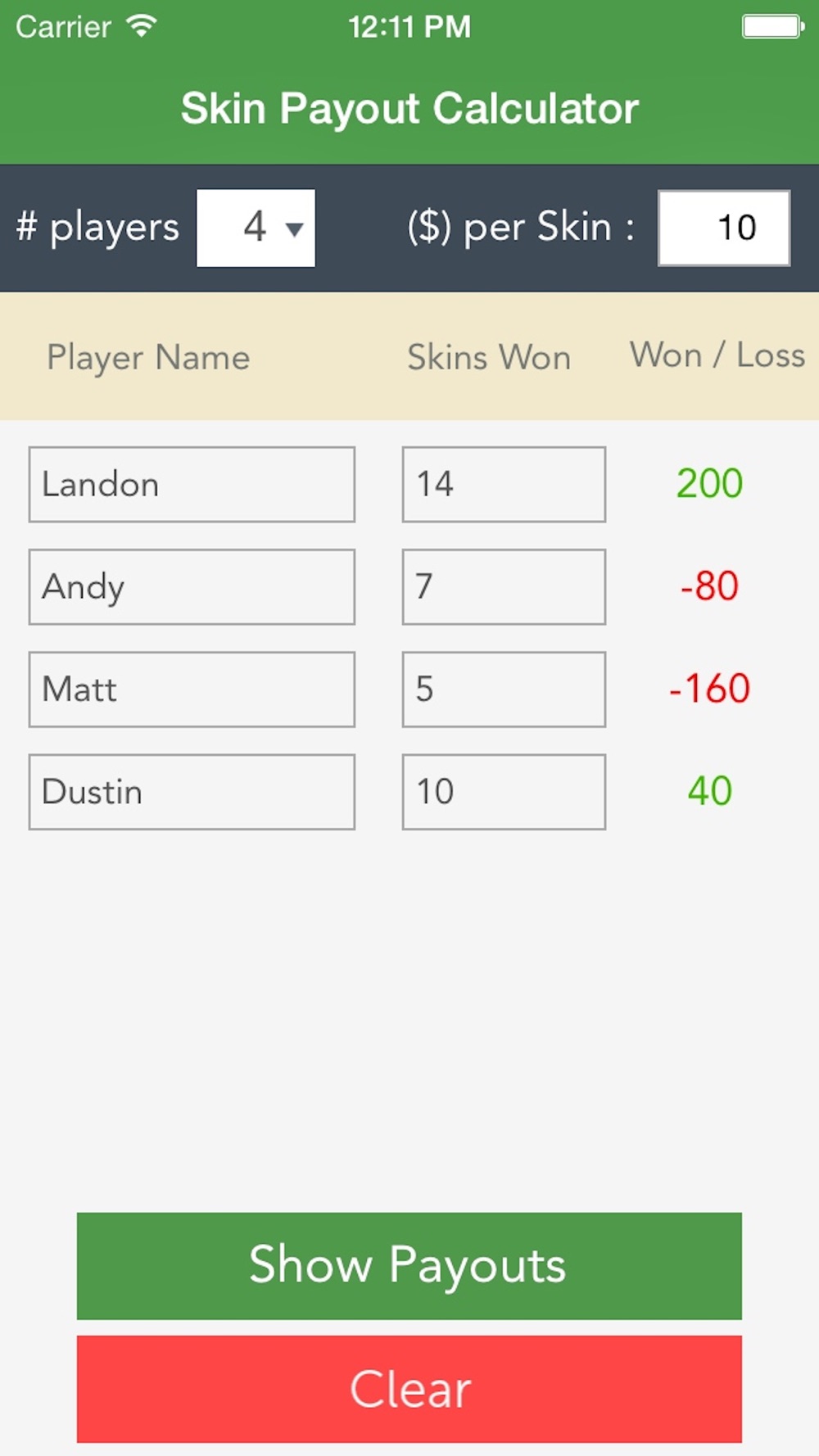 Calculates how much each player wins in a golf skins game and who pays who. Simple and easy to use.