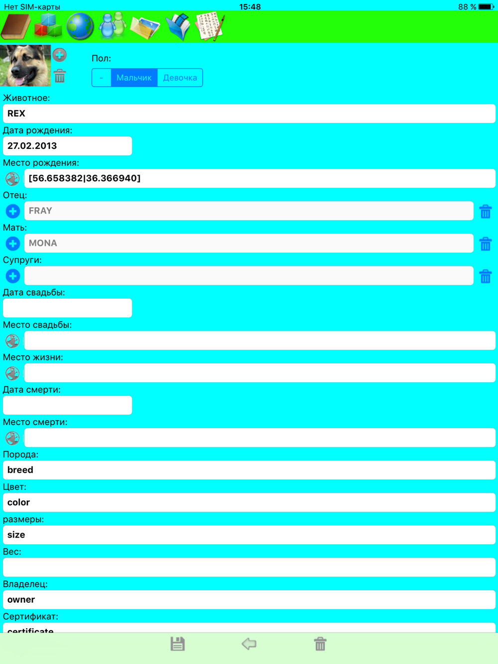 The application is designed to create a pedigree of an animal. Stores a list of animals, their photos and videos. Shows a calendar of pet birthdays.