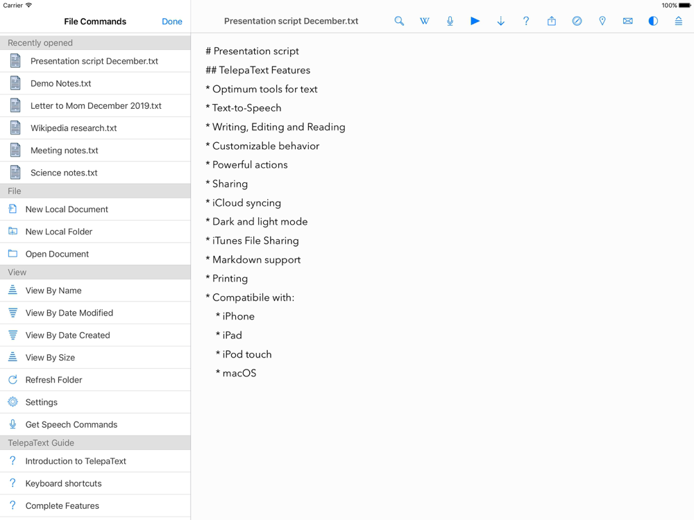 TelepaText provides essential text document editing, with extensive actions for text, research, speaking, sharing and viewing, built for iPad, iPhone, macOS and iCloud. Text-to-speech, dictation, speech commands and speech feedback are featured in TelepaText. Documents are automatically synced between your devices with iCloud. A common display style and command interface is provided on both platforms for best productivity.