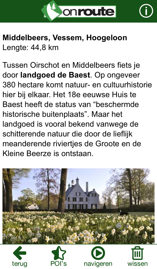 De OnRoute App is een App voor leuke en spannende fiets- wandel- en vaarroutes. In de routes van de App staat veel handige informatie over de interessante locaties (POI’s) waar je in de buurt komt, en je wordt er automatisch op geattendeerd als je aan het wandelen of fietsen bent. Overigens: je krijgt ook suggesties voor horeca-gelegenheden, picknick-plaatsen, musea enzovoort in de buurt.