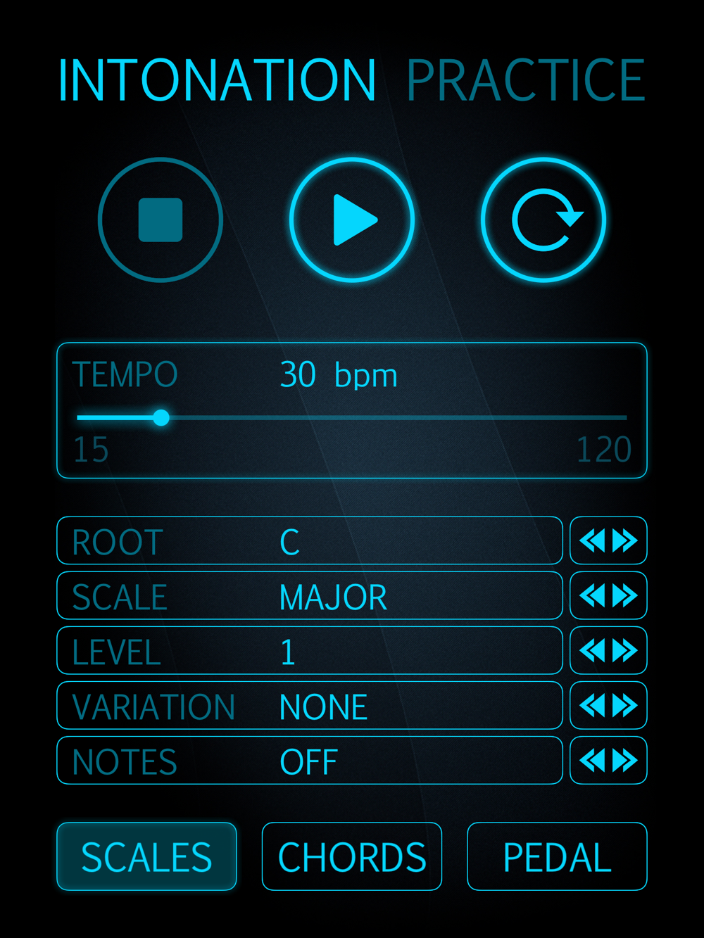 This app plays scales (major, minor), chords (major, minor, diminished, augmented) or organ points in all 12 keys. The looping function and adjustable speed makes this app your perfect companion for daily practicing.