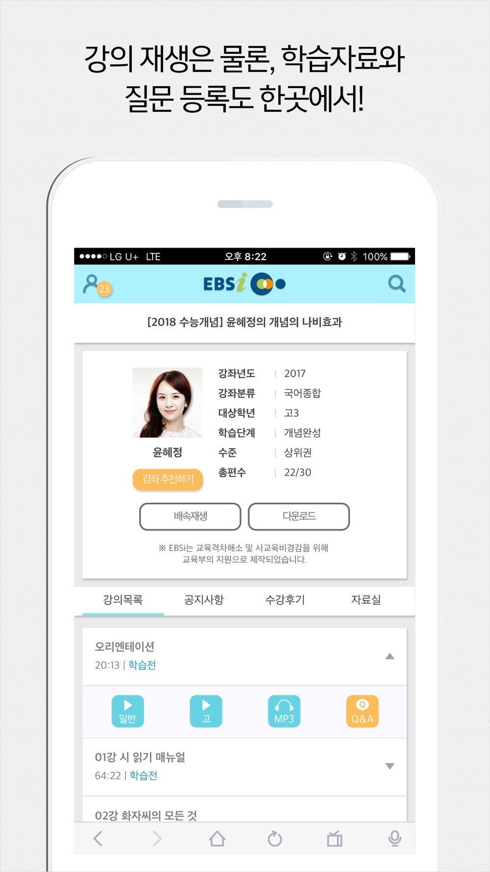(배속 재생과 자막, 강의 다운로드는 EBSi 고교강의앱으로 이동하여 이용 가능)