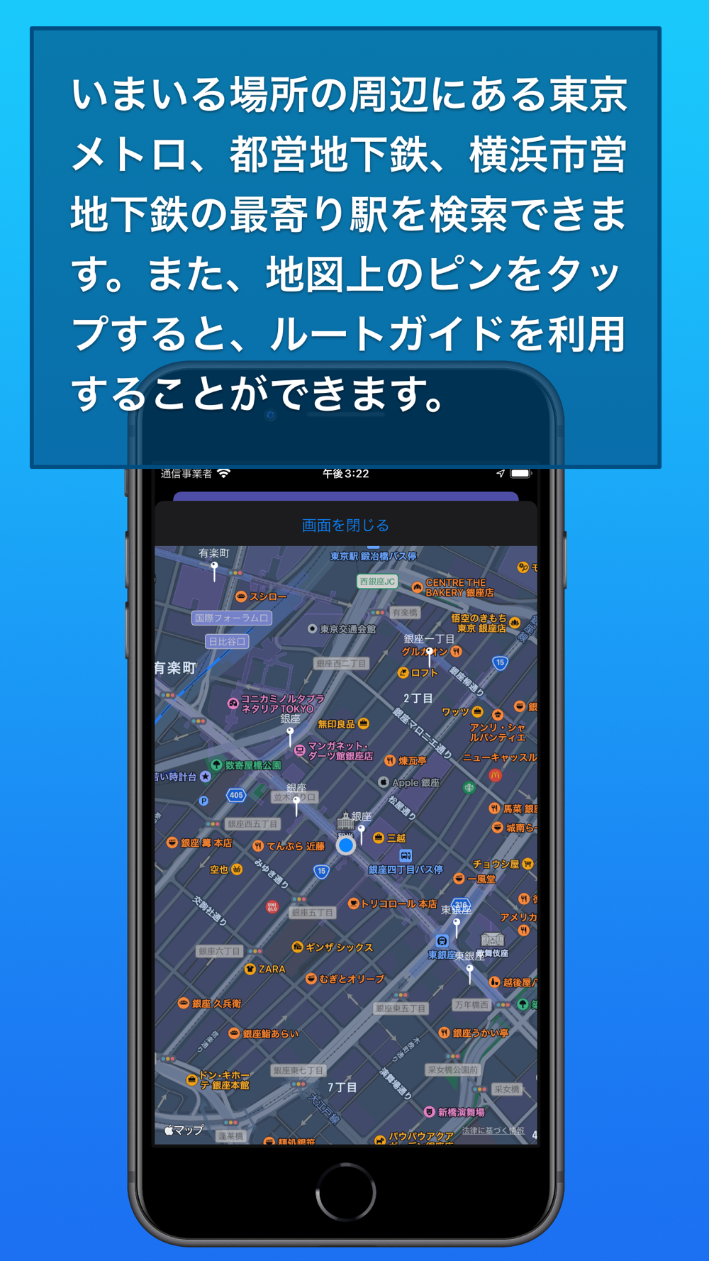 ・付録的な機能として、アプリでは現在地付近にある東京メトロの駅と周辺スポットの検索、アップルウォッチでは在地付近にある東京メトロの駅の検索をご利用いただけます。