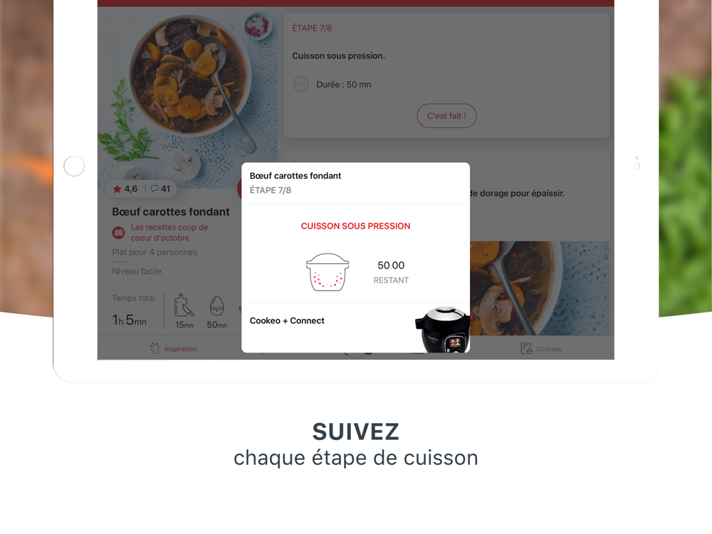 - Réaliser le pas à pas de la recette en simultanée sur l’application et sur Cookeo + Connect via une connexion Bluetooth Smart, pour assurer un résultat toujours parfait.