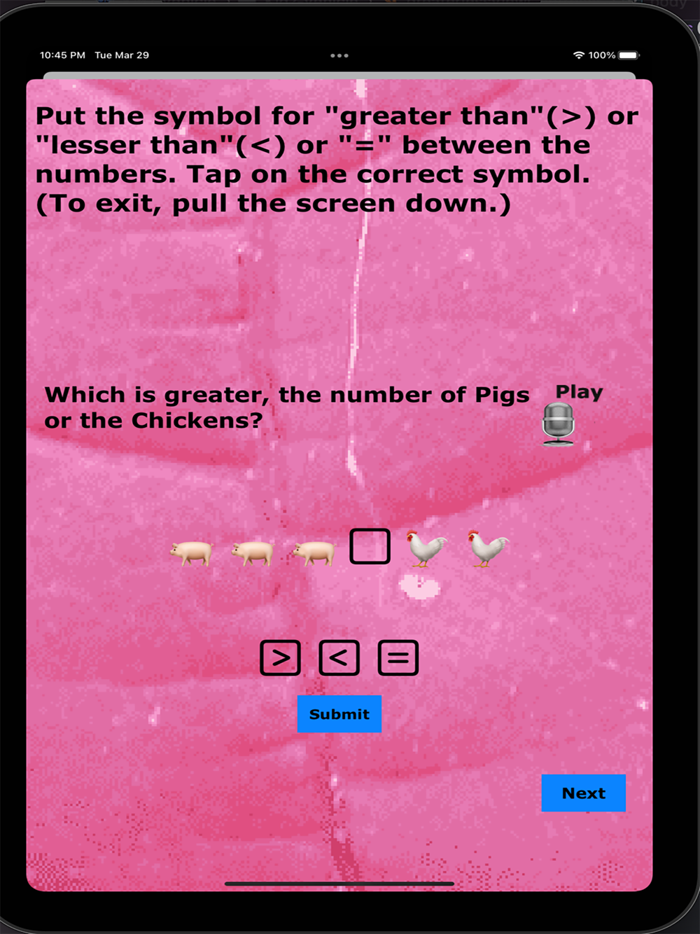 There is a fun exercise to revise the numbers by placing the symbols (greater than, less than and equal). There is also an exercise to touch the missing numbers in sequence between the minimum and the maximum number.