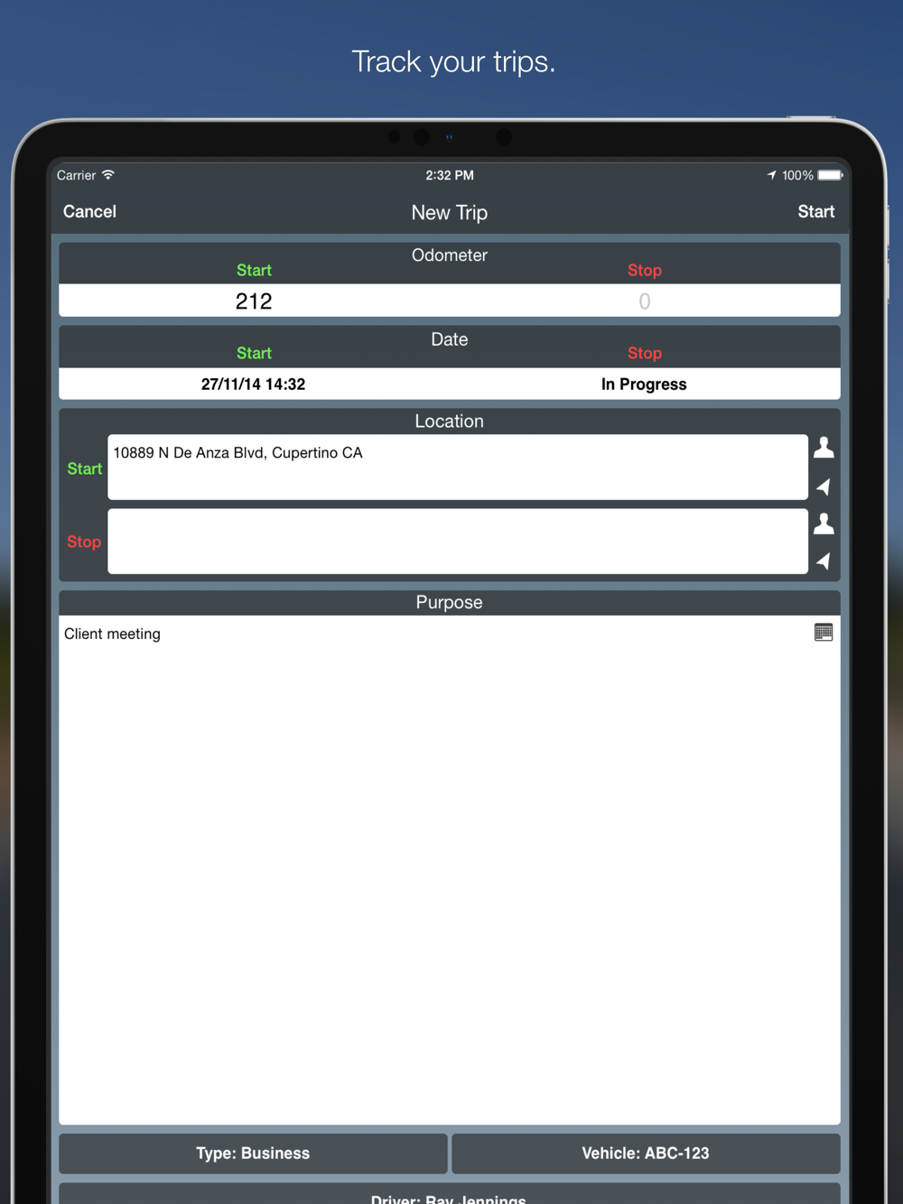 - Log trip details (odometer, date, purpose, type, location, vehicle).