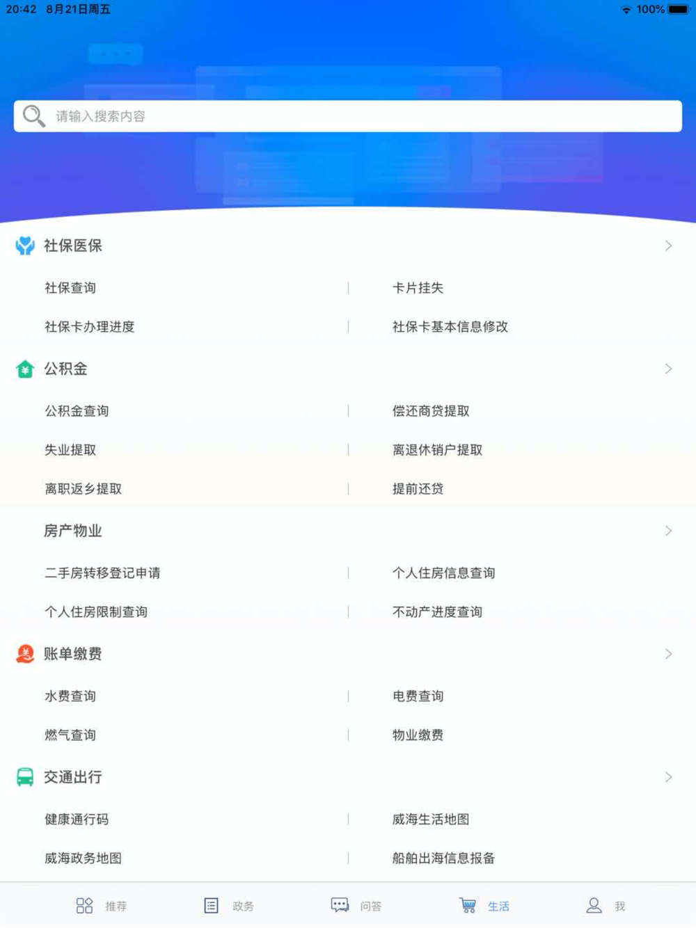 爱山东·威海APP,是威海市掌上综合办事服务平台,围绕与企业生产和群众生活密切相关的政务、公共和便民服务事项,打造全市统一的移动政务服务“总门户”,以“政务服务,一网通办”为目标,规范整合各级政府部门的便民服务系统,推动实现移动端服务“掌上通、全市通、掌上查、掌上办”。爱山东·威海APP设有“推荐、政务、问答、生活、我的”5个频道,涵盖审批办事、社保医保、交通出行、优抚救助、电子证照等15大主题,提供数百项政务和民生服务应用。