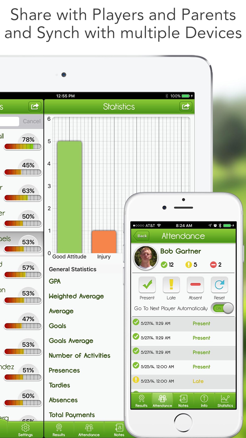 iGrade ayuda a entrenadores, jugadores y padres para colaborar y acceder a información precisa sobre los jugadores, prácticas, juegos, asistencia y mucho más.