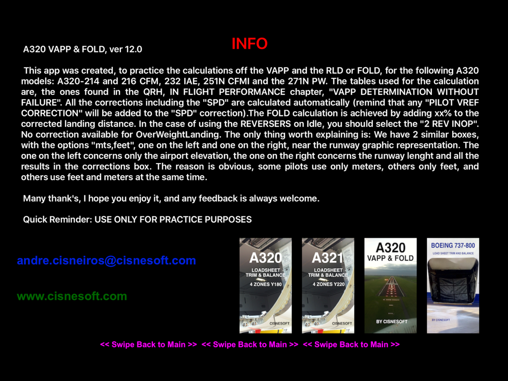 This app was created, to practice the calculations off the VAPP and the RLD or FOLD, for the following A320 models: A320-214 and 216 CFM, 232 IAE, 251N CFMI and the 271N PW.