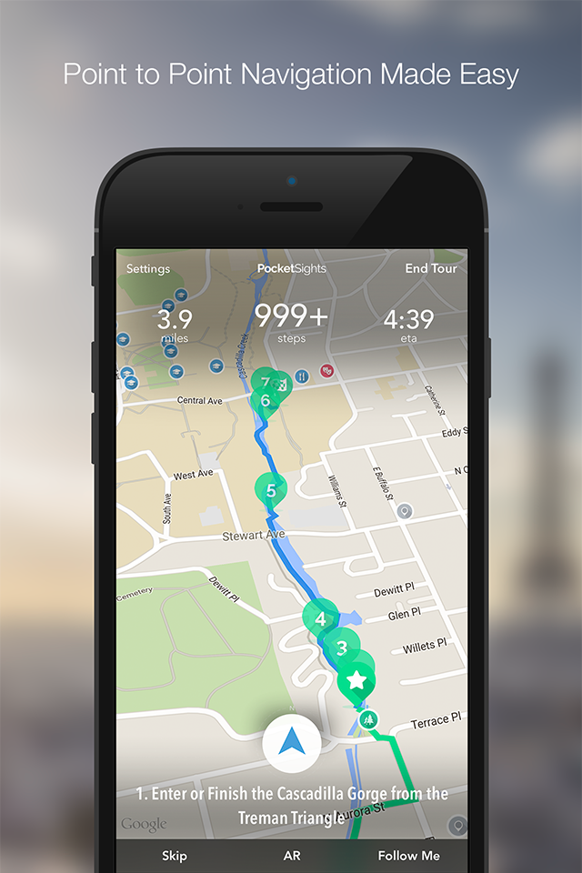 The PocketSights Tour Guide will find the tours nearest to you, but you can also search for locations by city and state and then scroll to preview and start the tours. The tour distance will display and provide directions to each point of interest. When you get close enough to the point of interest, the location will display the photos, texts, audio, and videos added to the tour.