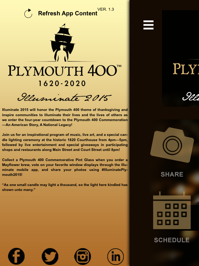 The events that took place in Plymouth Colony almost 400 years ago will resonate across the globe as the seeds upon which this nation was sown. This November, join Plymouth 400 and our partners around the world as we GIVE THANKS and GIVE BACK. Plymouth, Massachusetts will celebrate Illuminate Thanksgiving on Saturday, November 19, 2016 as part of America's Hometown Thanksgiving Weekend. Illuminate Thanksgiving will kick off at 4pm at the Hedge House on Water Street in Plymouth with an inspirational program filled with live music, inspiring words, and illuminated art. Following the program, downtown Plymouth shops and restaurants will illuminate their windows with festive displays and offer special entertainment, programming and more! Join us in downtown Plymouth, Massachusetts for an inspiring evening!