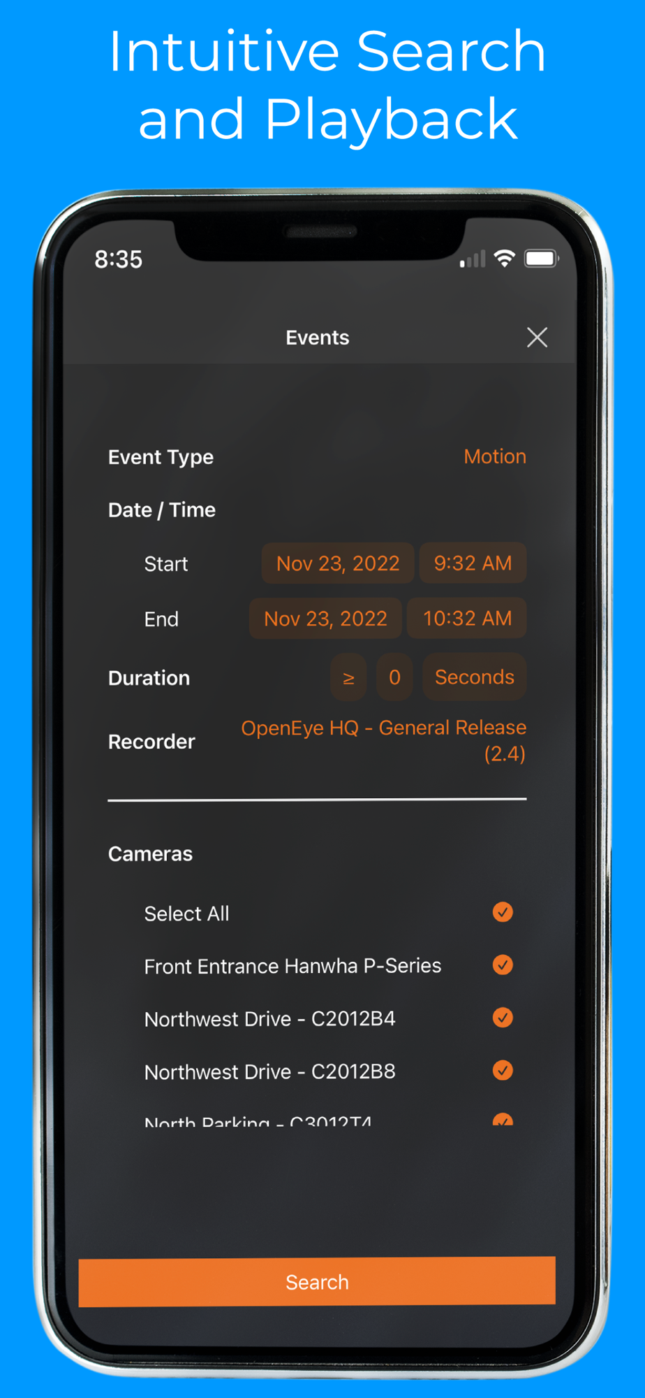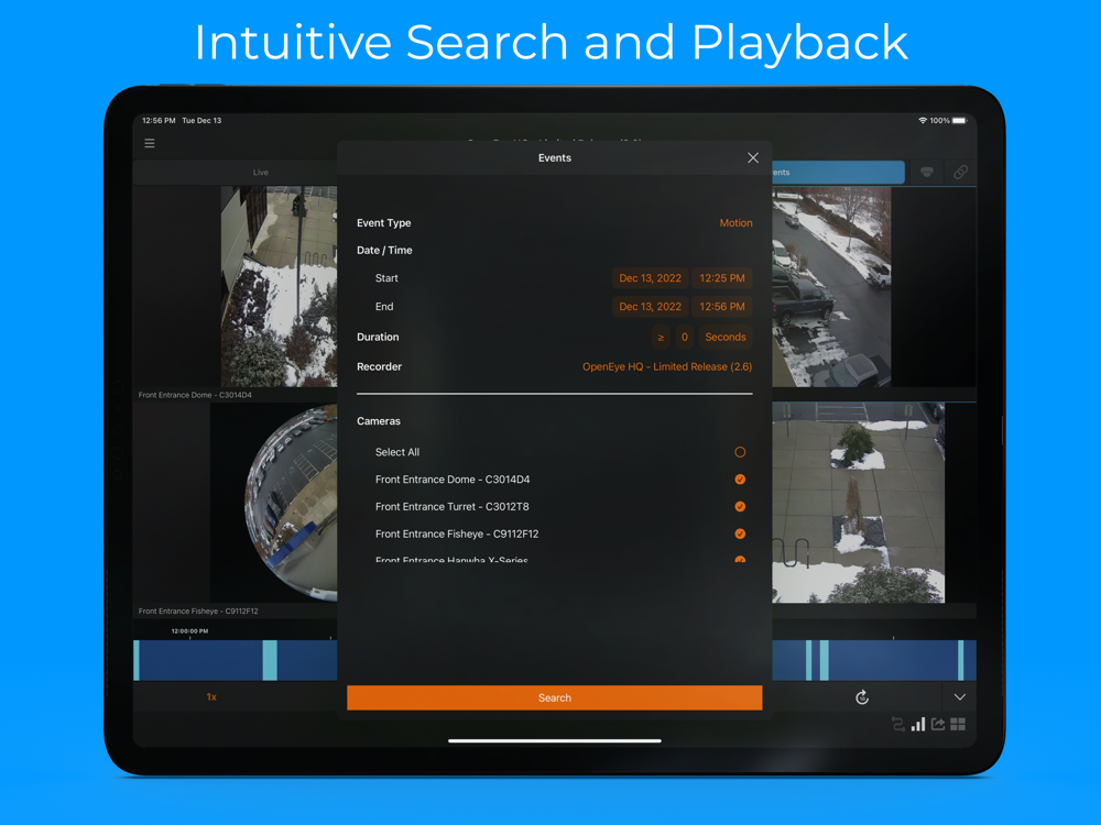 • Specialized search for motion, sensor, intrusion, access, analytics, and queue events