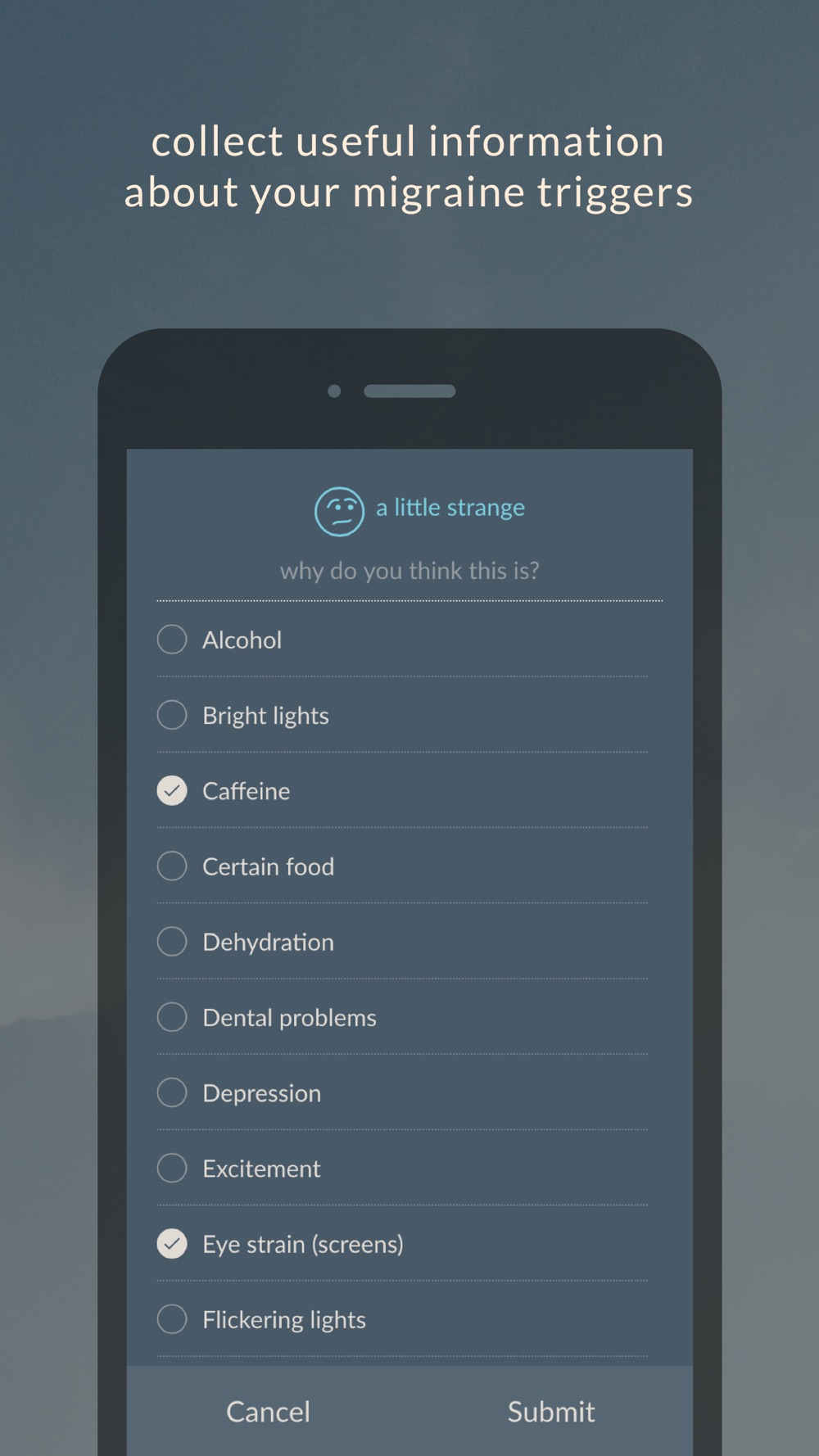 Many migraine sufferers can feel an "aura" before the migraine begins. By submitting your own condition, detailed information is collected about the exact weather in your area allowing the causes of your migraine to be analysed. In this way, over 40 pieces of unique data help to build a fingerprint associated with your migraine.